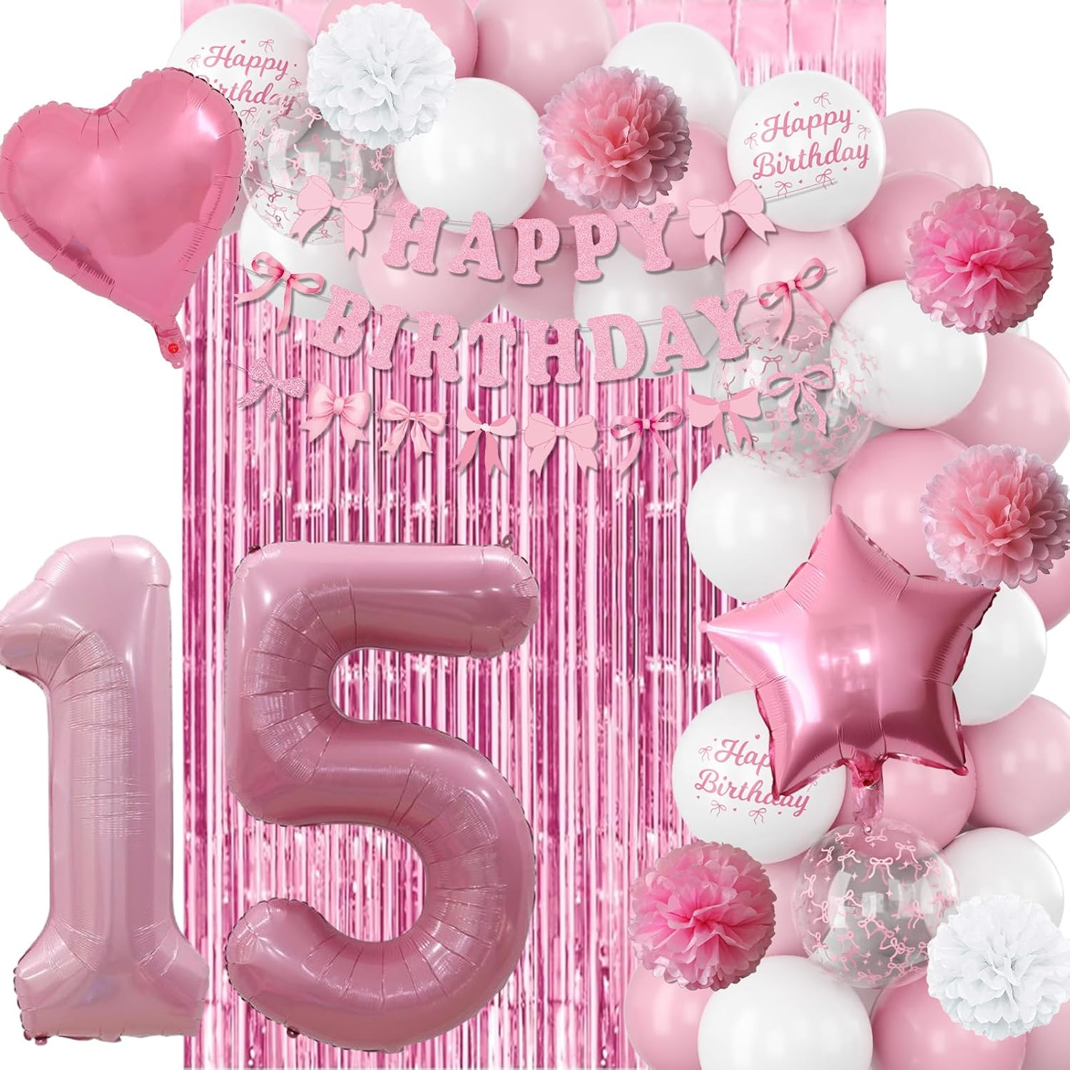 - PACKAGE INCLUDES: 1pc pearl pink number 15 balloon, 1pc bow happy birthday banner, 2pcs pink paper pom poms, 2pcs light pink paper pom poms, 2pcs white paper pom poms, 1pc pink curtain, 1pc light pink star foil balloons, 1pc light pink heart foil balloons,6pcs light pink balloons, 6pcs pastel pink balloons, 4pcs white balloons, 2pcs birthday printed balloons, 2pcs bow clear balloons, 1pc ribbon