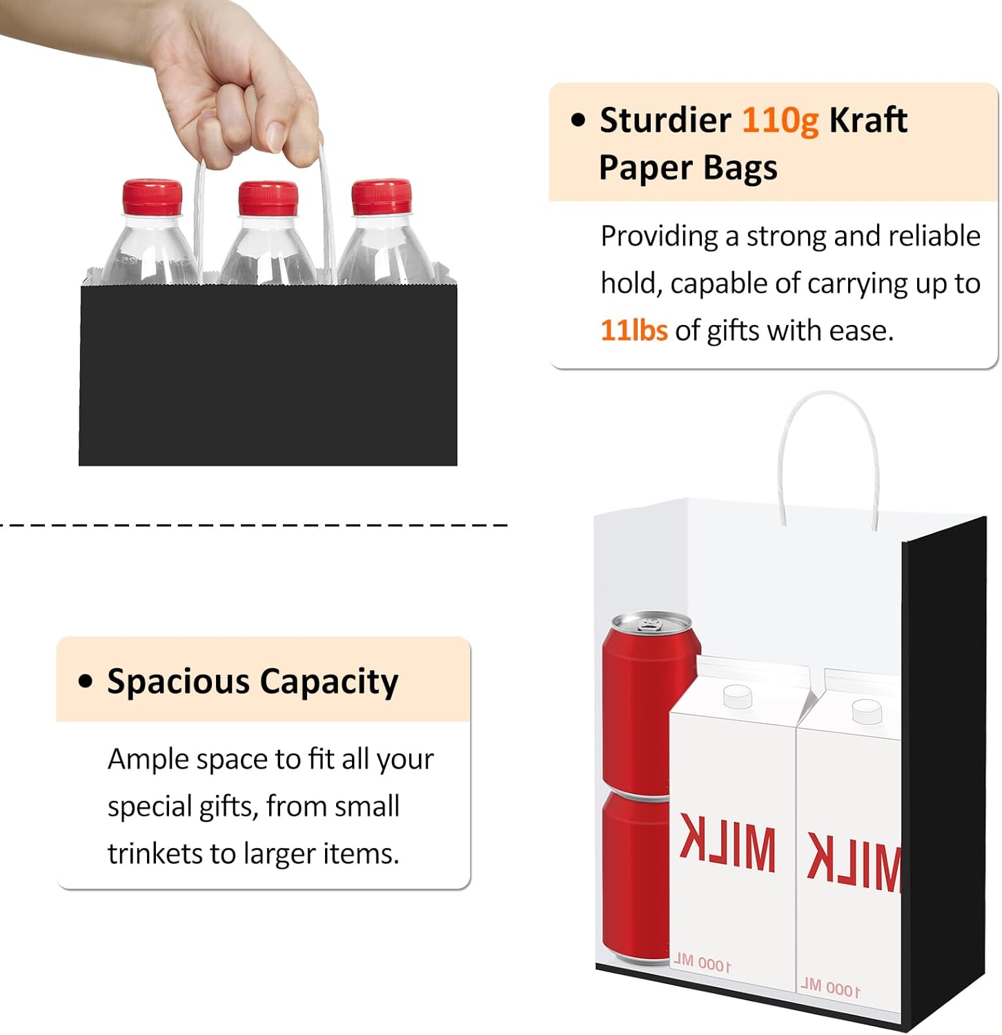 - Large Gift Bags: 10"L x 5"W x 13"H. Crafted from durable paper with an appropriate thickness, securely glued handles and reinforced bottom, these black paper bags are strong enough to carry items without tearing