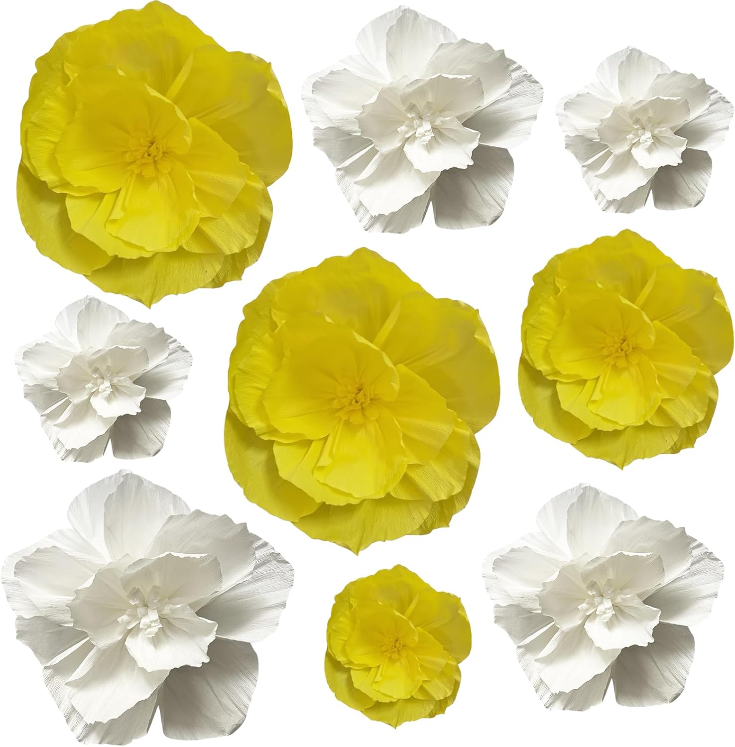 BRT Bearingshui Crepe Paper Flowers Decoration for Wall Total 9 Pcs, Artificial Flowers Backdrop for Wedding Decor Baby Bridal Shower Birthday Party, Yellow White 3D Wall Flowers Decor
