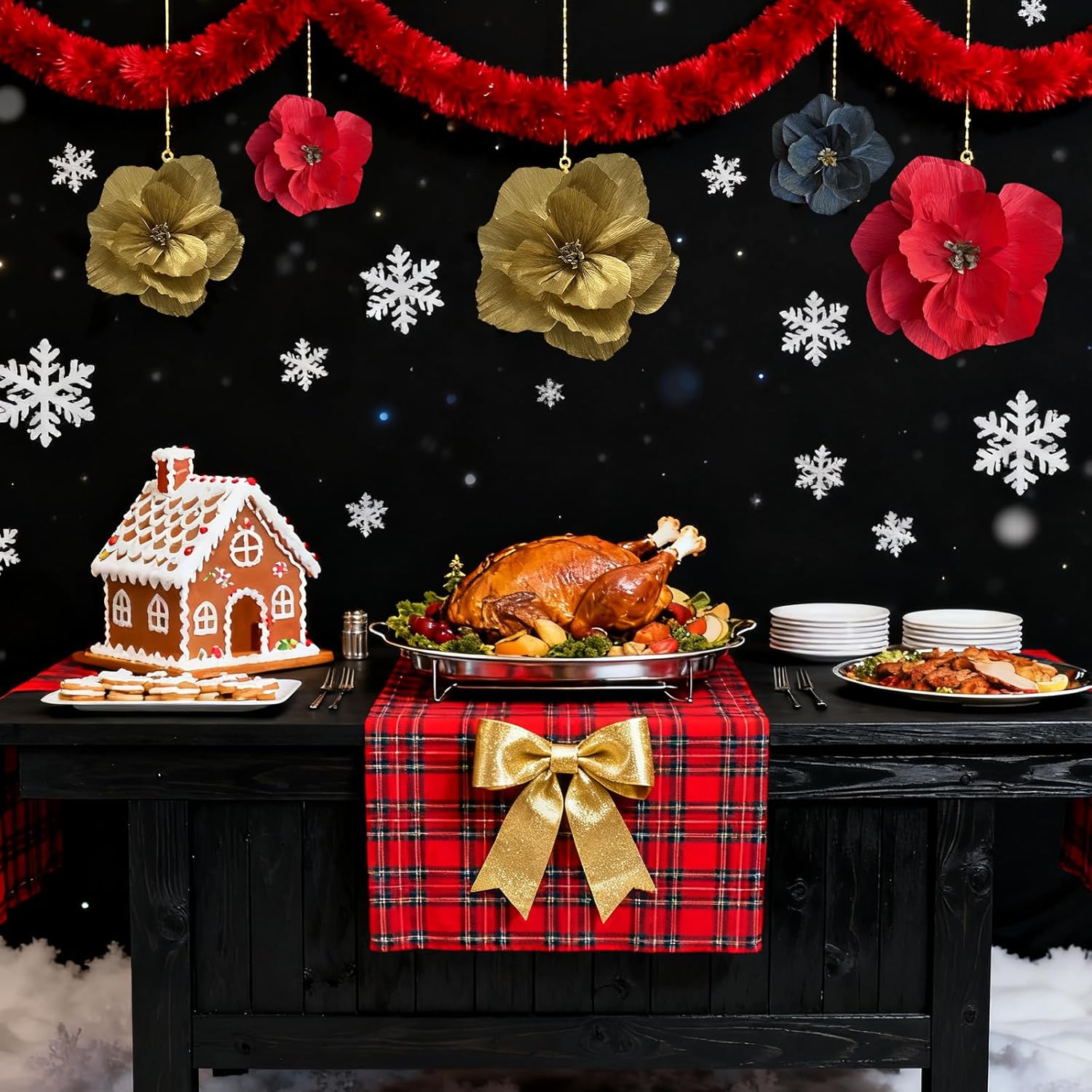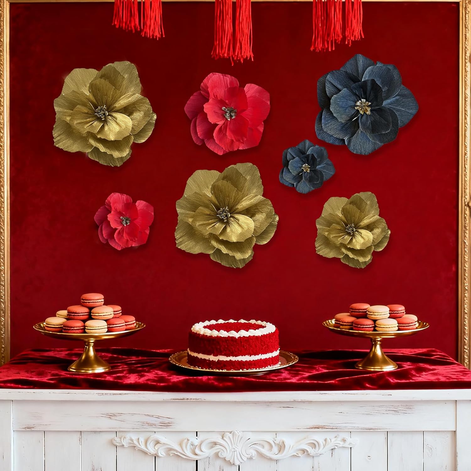 - Crepe Paper Flowers: Total 6pcs gold red black paper flowers in 3 sizes 12”, 10”, 8”.