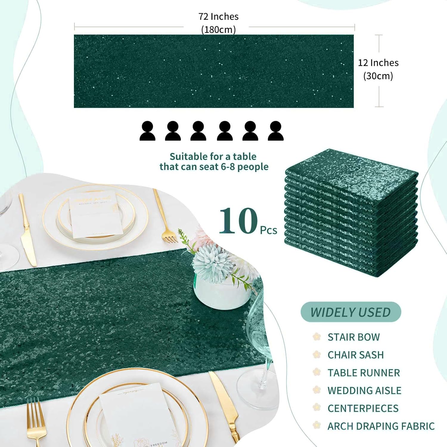 - Emerald Green Sequin Table Runners: Package includes 10 pack of emerald green table runners for your daily use. Measured about 12x72 inches(30x180cm). Great ideal for wedding table decorations for the receptionthe sequin table runners is long enough to fit rectangle and round tables that can seat 6 to 10 people.