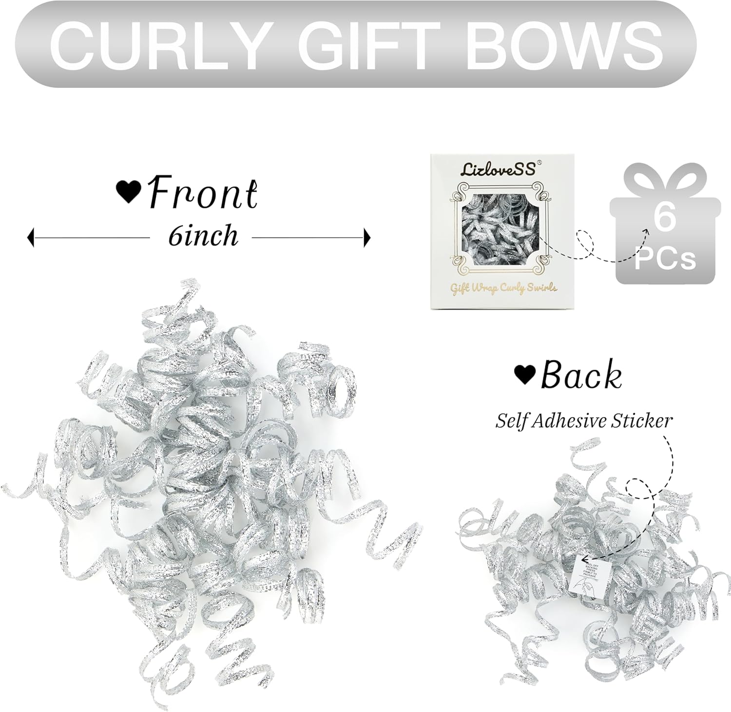 6" Metallic Silver Christmas Curly Ribbon Bows for Gift Wrapping Self Adhesive Gift Bows for Holiday Decor, Baskets, Birthday, Wedding, Presents, Party Favors Decorations 6 Counts