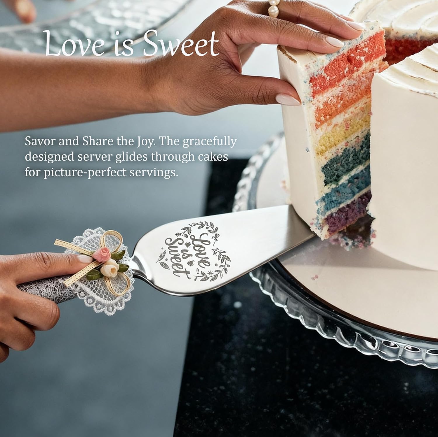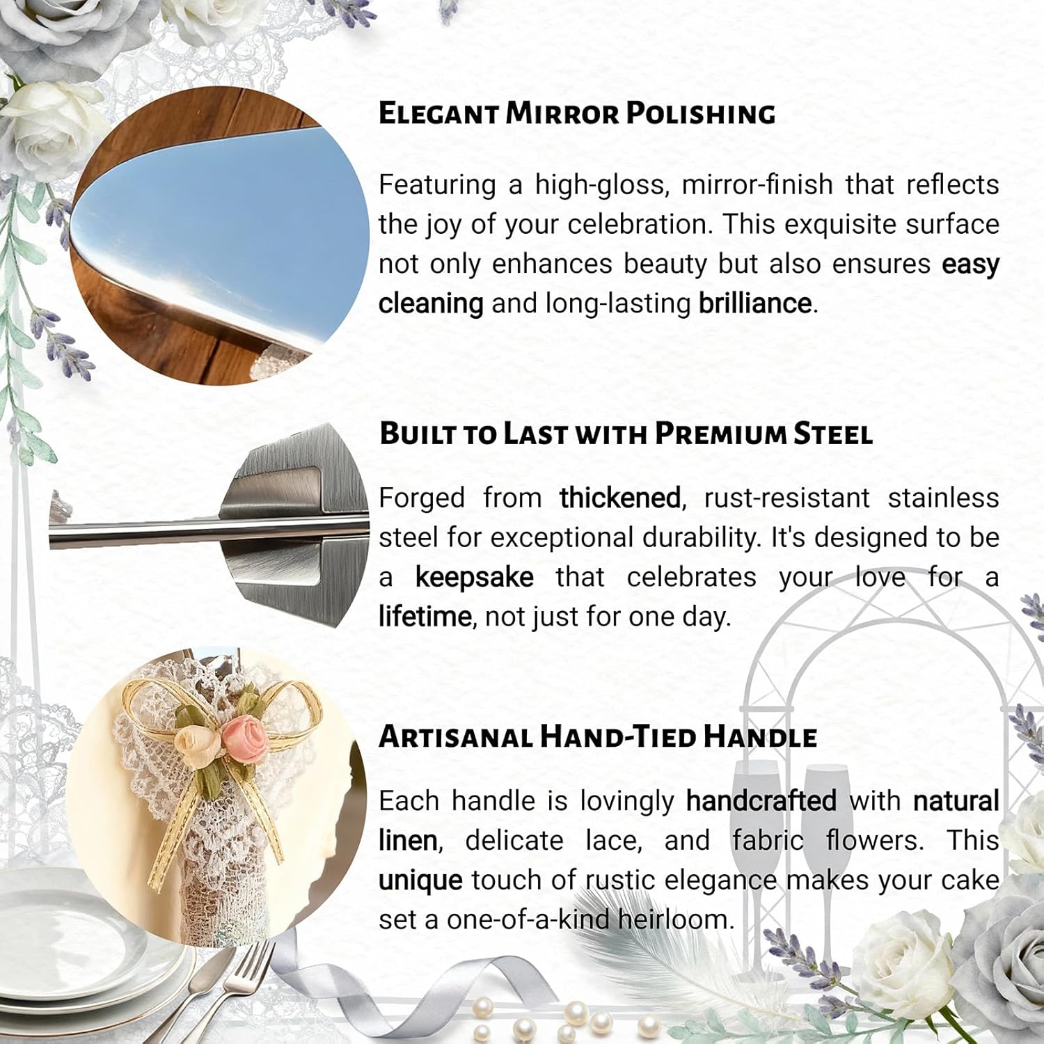 - Elegant Wedding Cake Cutting Set – Includes a 10.83-inch serrated cake knife and 10.04-inch server, designed for weddings, anniversaries, engagements, and bridal showers.