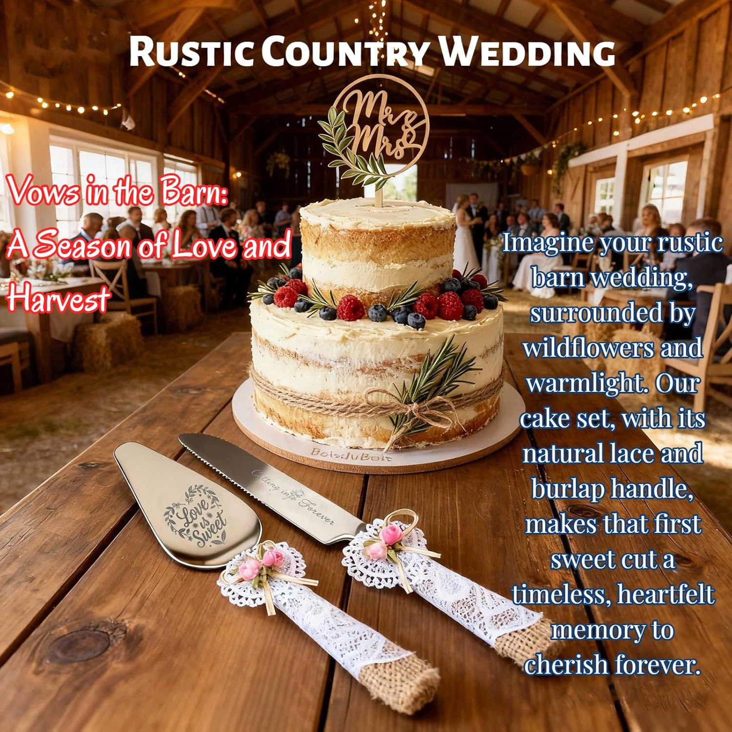 - Rustic Lace & Burlap Handles – Vintage-inspired design with lace, burlap, and ribbon flowers. Perfect for rustic, boho, or country weddings, adding timeless romance to your cake table.