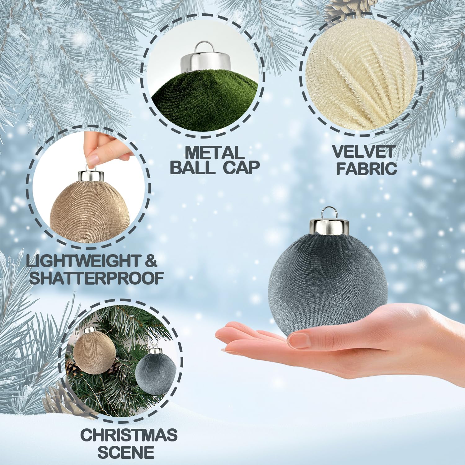 - Velvet Christmas Balls - This neutral-toned set includes 15 large ornaments: 6 in sage green and 3 each in light brown, beige, and gray. Each measures an impressive 3.15 inches, striking the perfect balance of scale and sophistication for your Christmas tree.