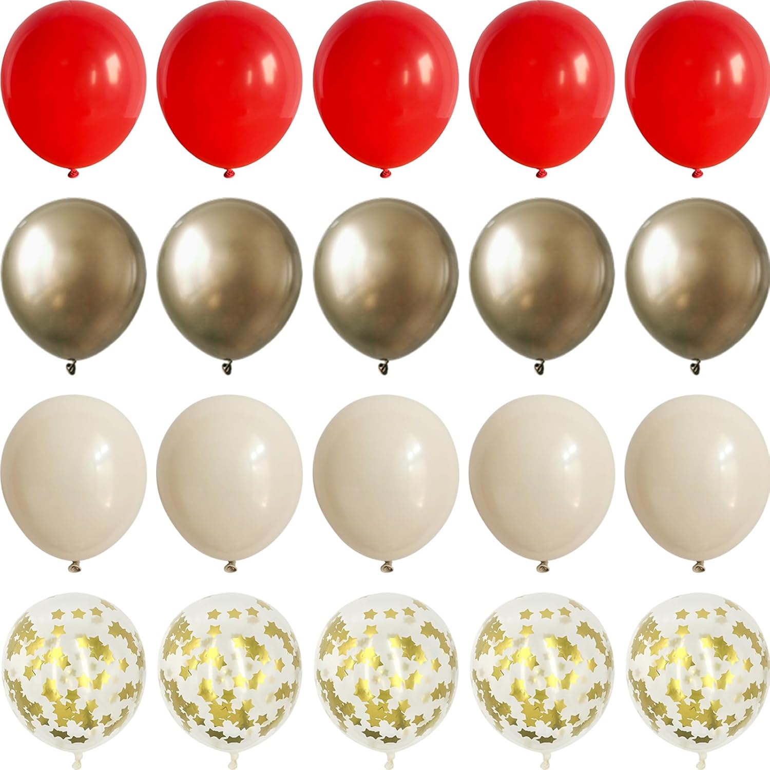 - Party Balloons Set: The christmas balloons set have 35pcs 12inch helium balloons, include 10pcs red balloons, 10pcs sand color balloons, 8pcs metallic chrome dark gold balloons, 7pcs gold star confetti balloons. The set comes with 1pc balloon ribbon to help you easily build balloon garland or arch.