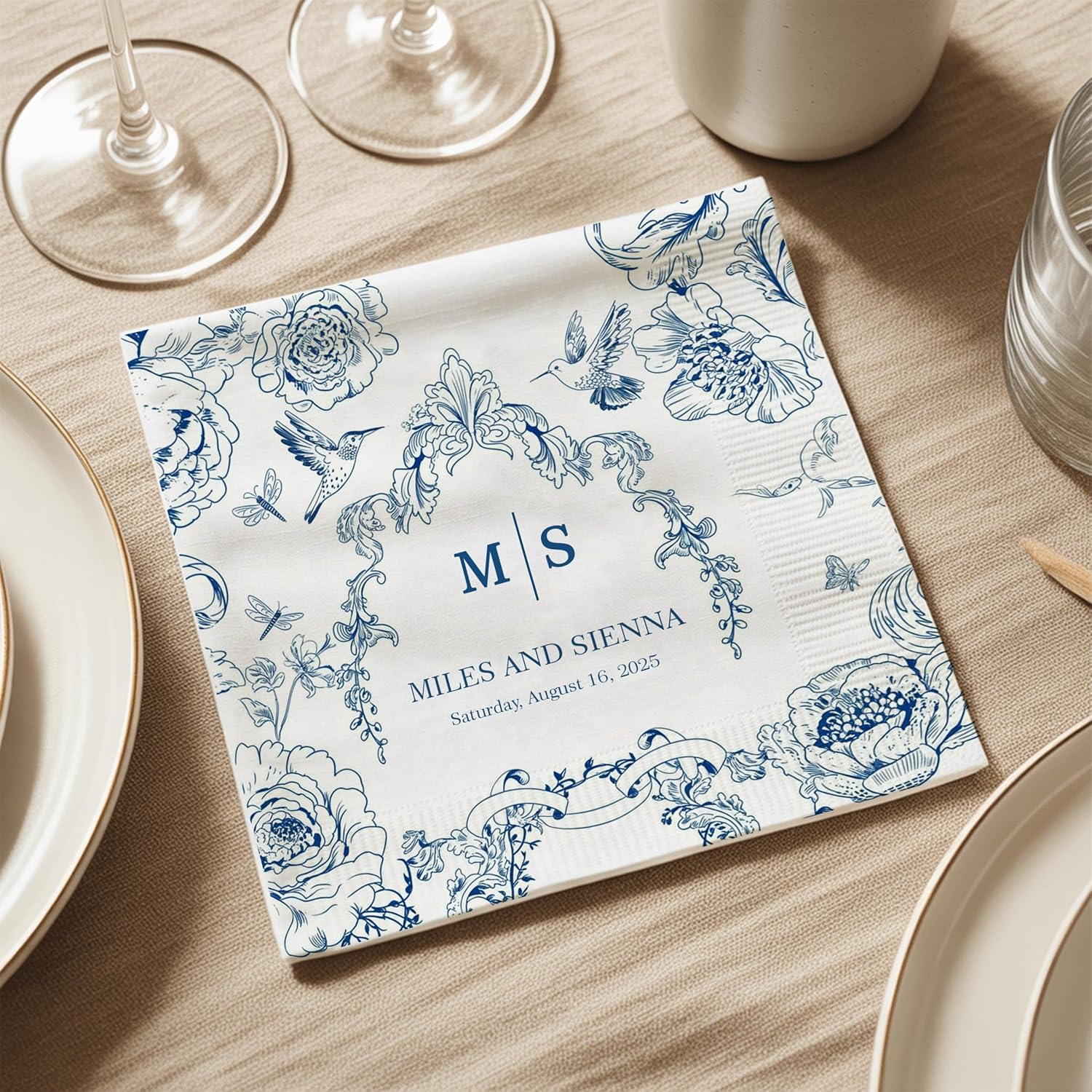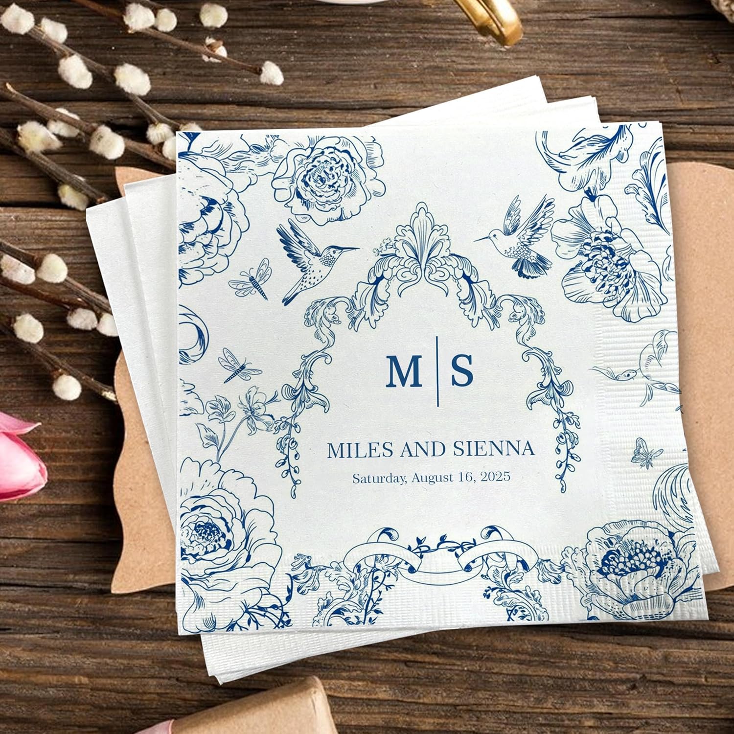 Custom Wedding Cocktail Napkins, Blue Floral Cocktail Napkins, Personalized Paper Napkin for Wedding Reception, Blue and White Flower Paper for Bridal, Engagement Party, Bridal Shower