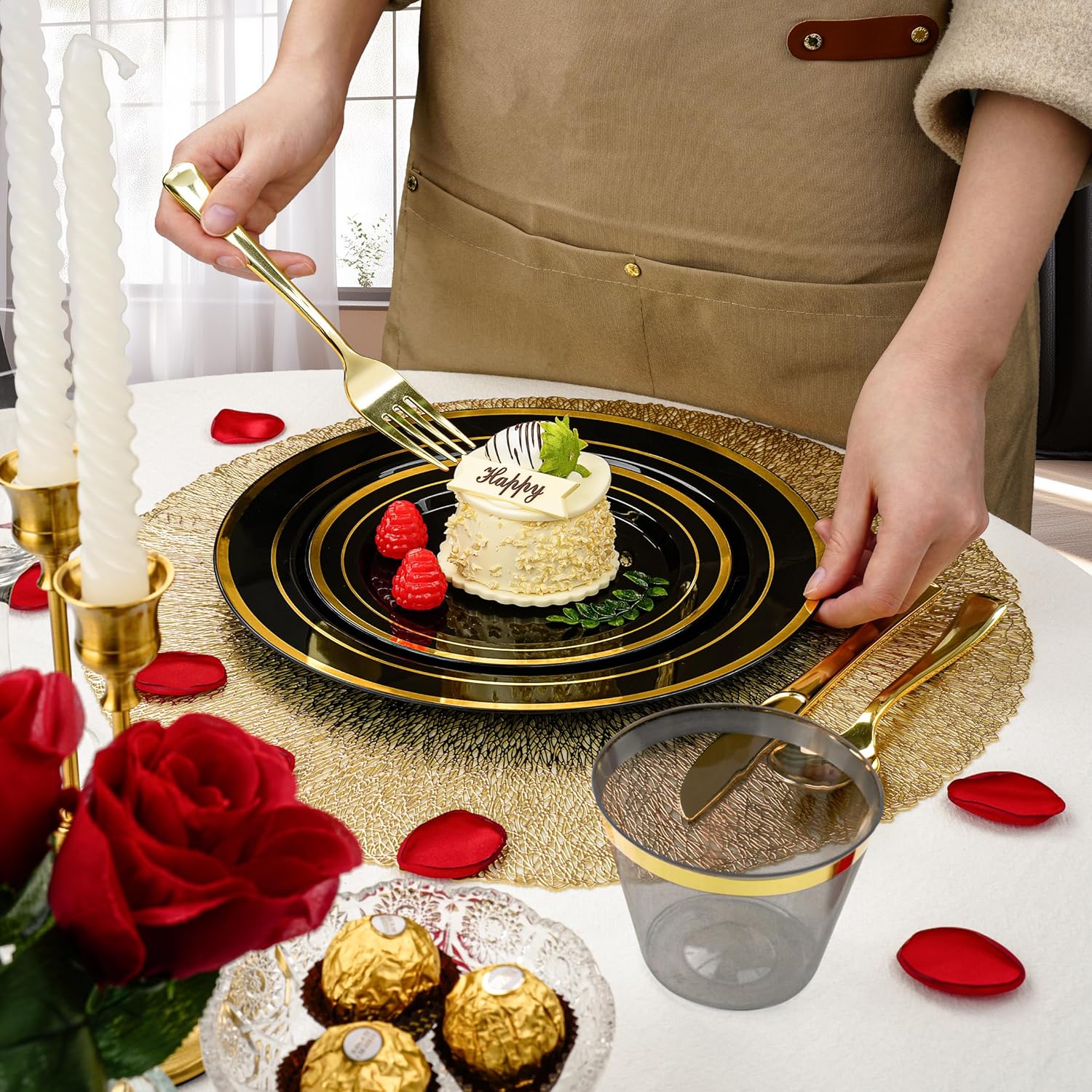 - WHAT YOU GET - Our 350-piece disposable dinnerware set is tailor-made for your 50 guests. You will receive a comprehensive package featuring 50 black gold plastic plates 10, 50 salad plates 7, 50 cups 9 OZ, 50 knives, 50 forks and 50 spoons.