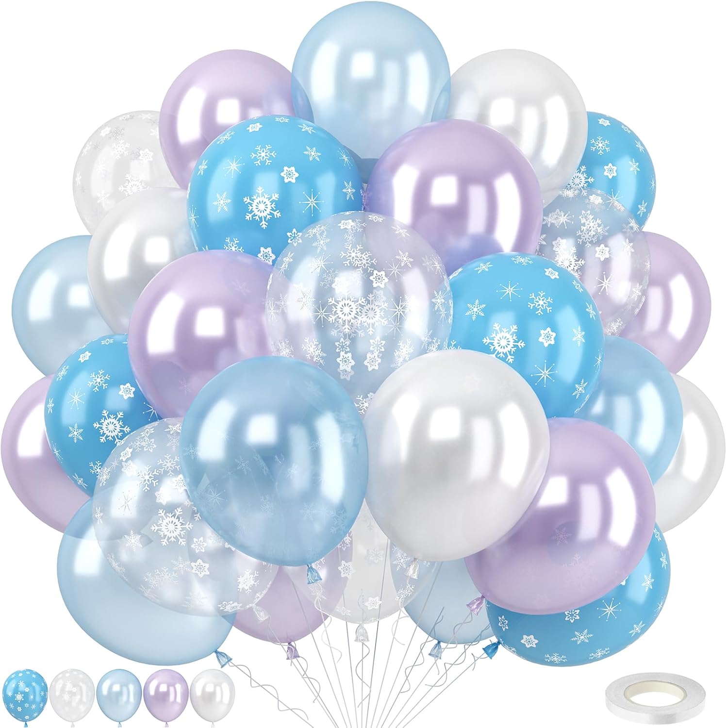 - 【Snow Balloons Set】This 12inch 50pcs winter iridescent balloons kit includes 15pcs pearl purple balloons, 10pcs pearl blue balloons, 15pcs pearl white balloons, 5pcs transparent snowflake balloons 5pcs blue snow balloons, and 1pc ribbon. A perfect choice for ice snow theme party and winter wonderland decorations.