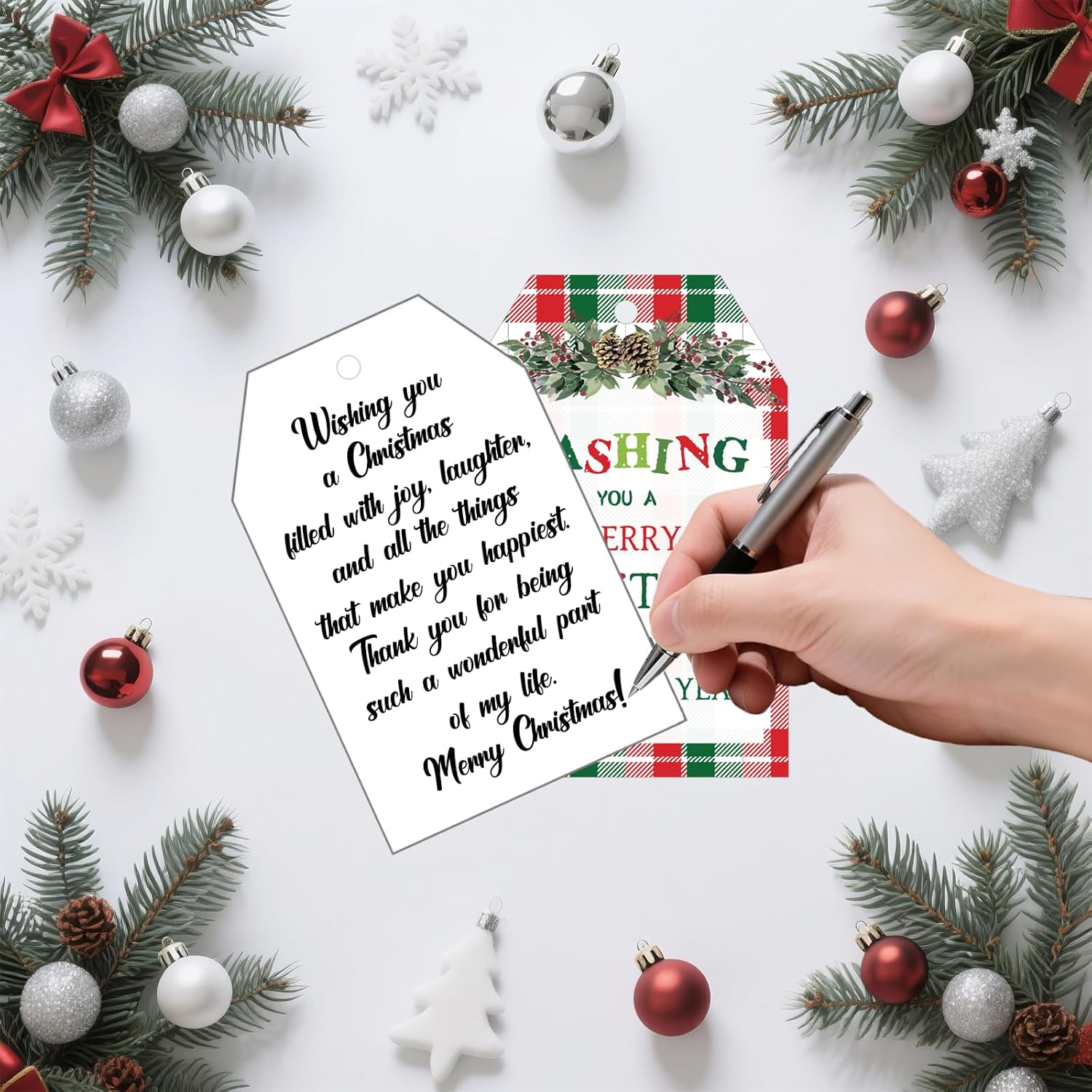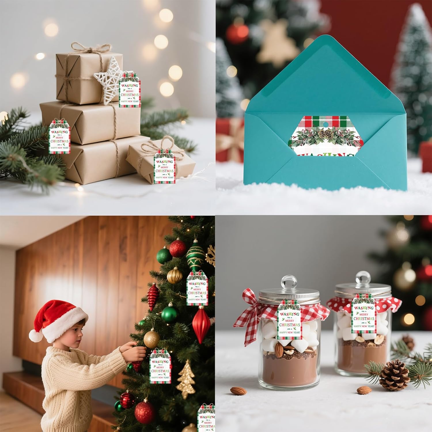 - [Charming Design] Featuring a classic buffalo plaid pattern combined with festive holly and pinecone illustrations, these Christmas gift tags exude a warm, nostalgic holiday vibe. Each tag is printed with the cheerful greeting "Wishing You A Merry Christmas And A Happy New Year," making them perfect for adding a personalized touch to your presents. The vibrant colors and detailed design ensure your gifts stand out during the holiday season.