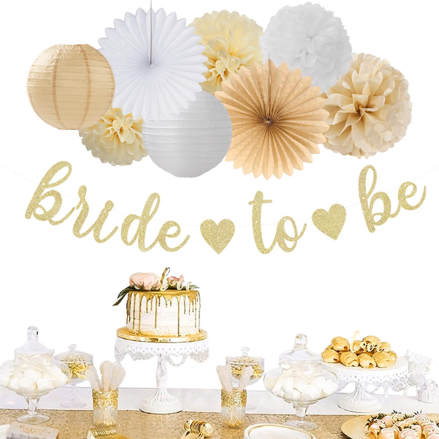 - 【Package Content】Champagne gold white fall bridal shower party decorations contains: 1 pcs bride to be banner, 1 pcs circle dots paper banner, 2 pcs hanging paper lanterns, 4 pcs tissue paper pom poms, 2 pcs paper fans, 6 paper swirls and 15 pcs tassel garland, total 31 pcs in 8 10 12 inch and champagne gold white peach color.