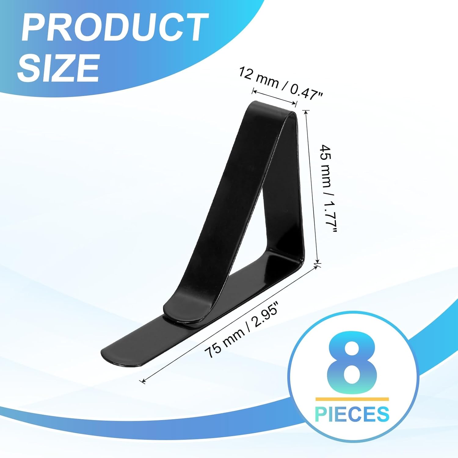 - What You Get: The Package comes with 8 pieces of tablecloth clips, with 75 x 12 x 45mm/2.95 x 0.47 x 1.77inch(L*W*H) in total size. Simple and generous design and sufficient quantity, enough to meet your daily needs and share with others