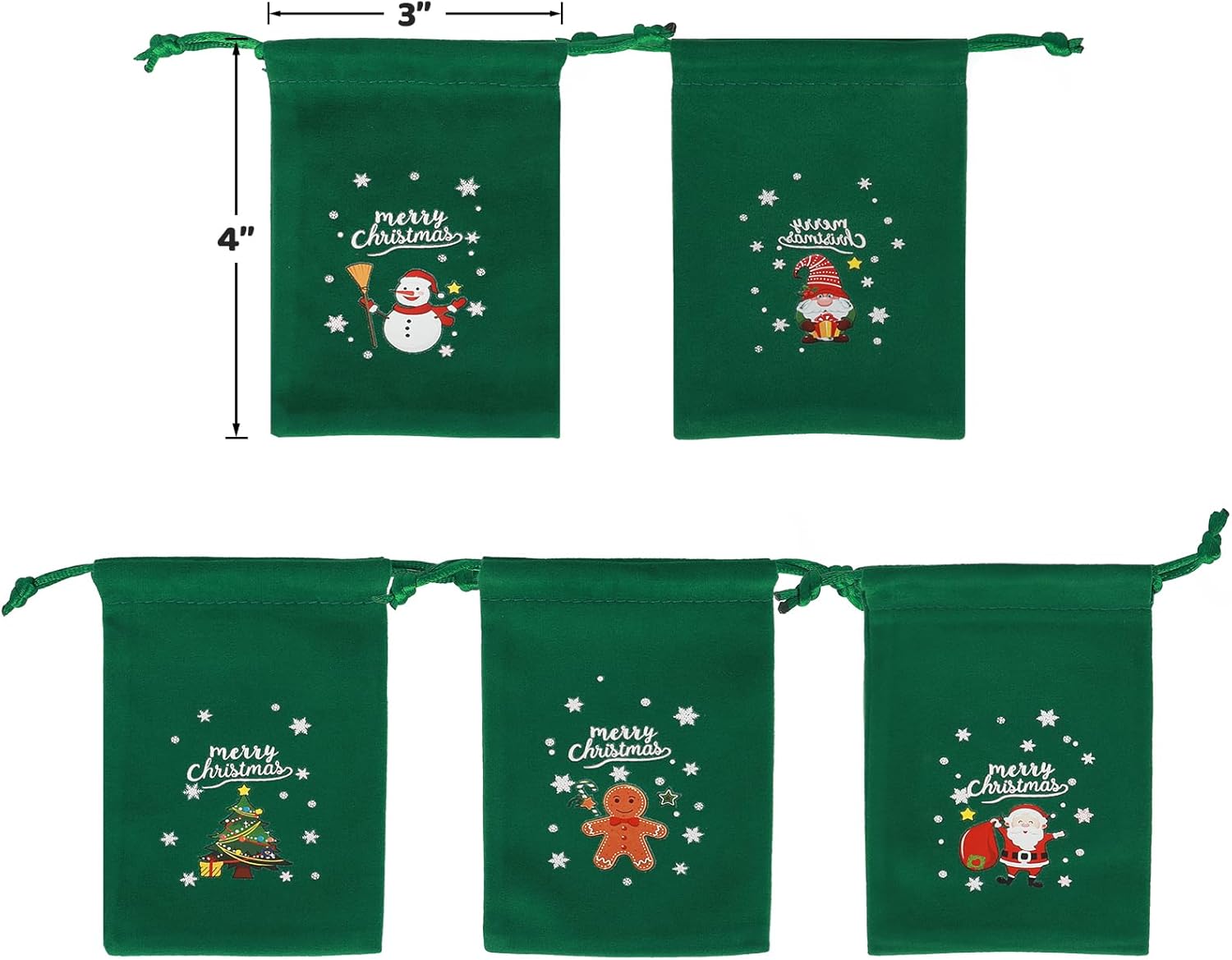 Tapleap Christmas Bags with Drawstring - 50Pcs 3x4 Green Velvet Coth for Wrapping Christmas Party Favors or Gifts for Friends, Children, Customers