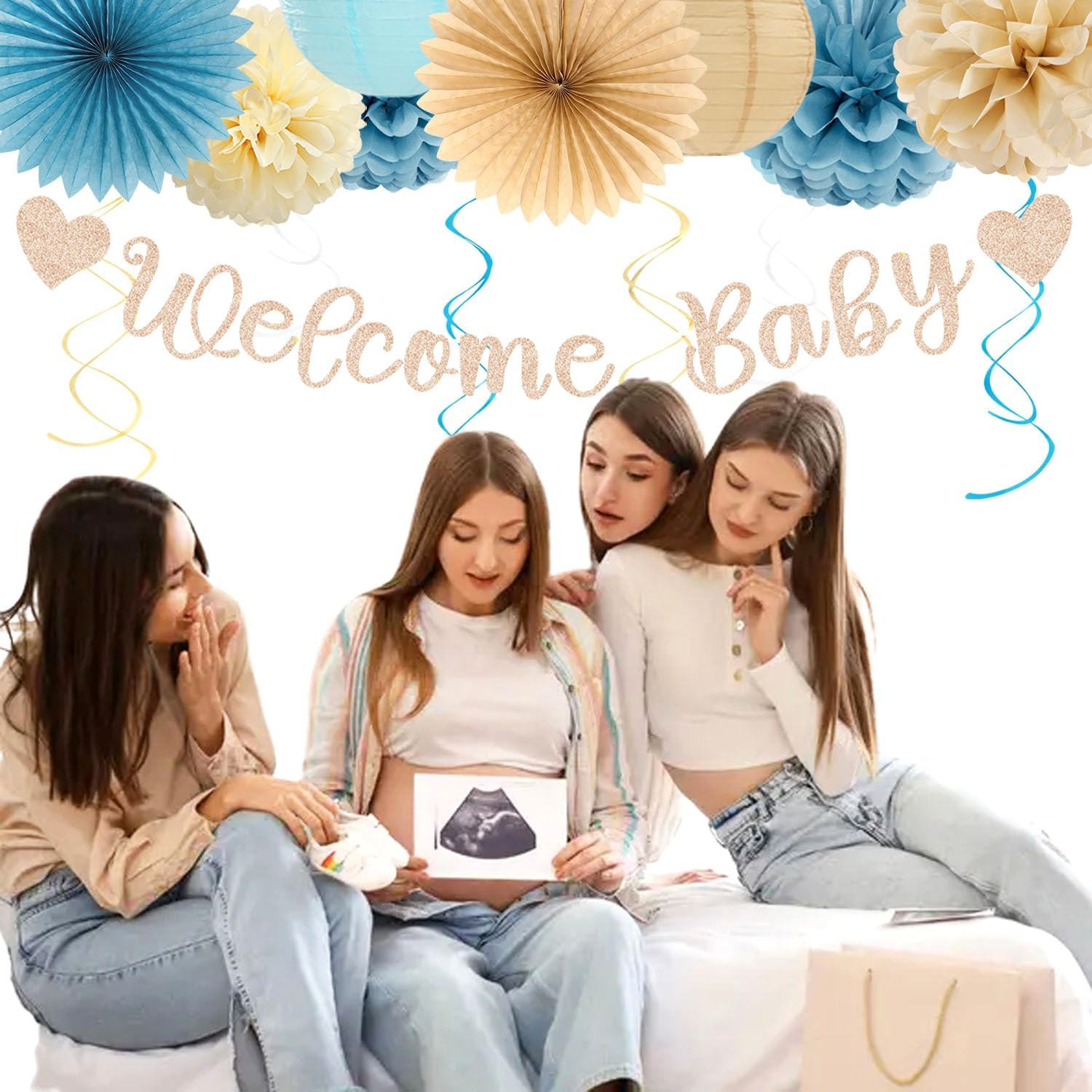 - 【Package Content】 Light dusty blue beige champagne baby shower party decorations contains: 1 pcs welcome baby streamers banner sign, 1 pcs circle dots paper banner, 2 pcs paper lanterns, 4 pcs tissue paper pom poms, 2 pcs paper fans, 6 paper swirls and 15 pcs tassel garland, total 31 pcs in 8 10 12 inch and blue beige champagne color.