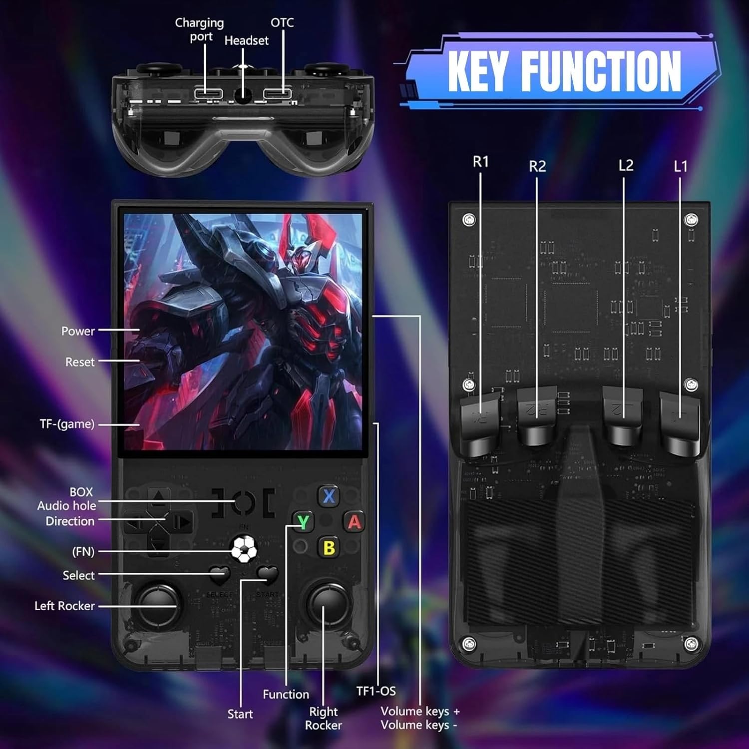 - 🕹️【High-performance R36MAX handheld game console】Retro gaming console comes with 18,000+ classic retro games, no need to download them, you can play them as soon as you get them. The video game console is equipped with a high-performance RK3326 1.5GHz ARM64bit quad-core Cortex-A35 CPU Linux system, which gives you an extremely smooth and sensitive gaming experience when running various emulators.