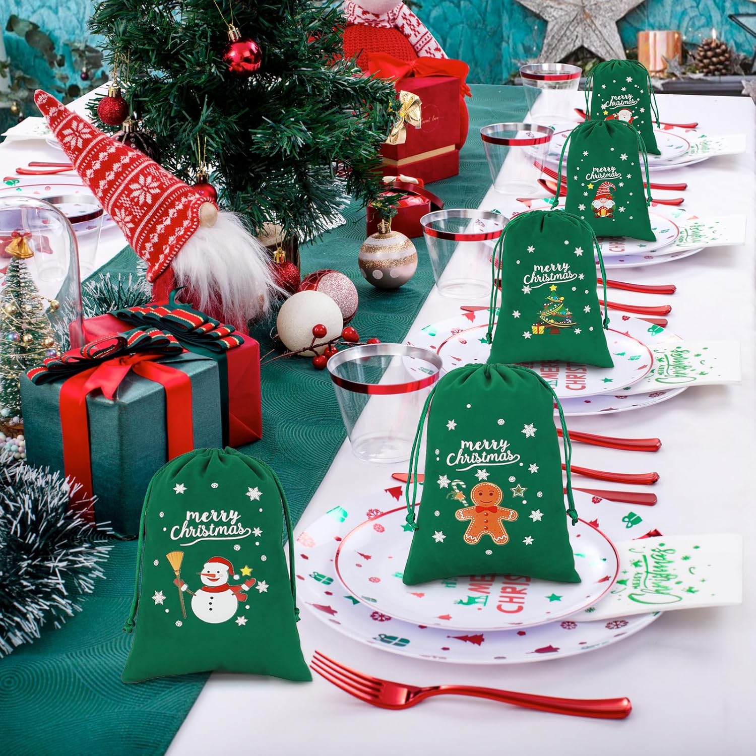 Tapleap Coth Christmas Bags with Drawstring - 50Pcs 5x7 Green Velvet for Wrapping Christmas Party Favors or Gifts for Friends, Children, Coworkers, Small Bussiness Products