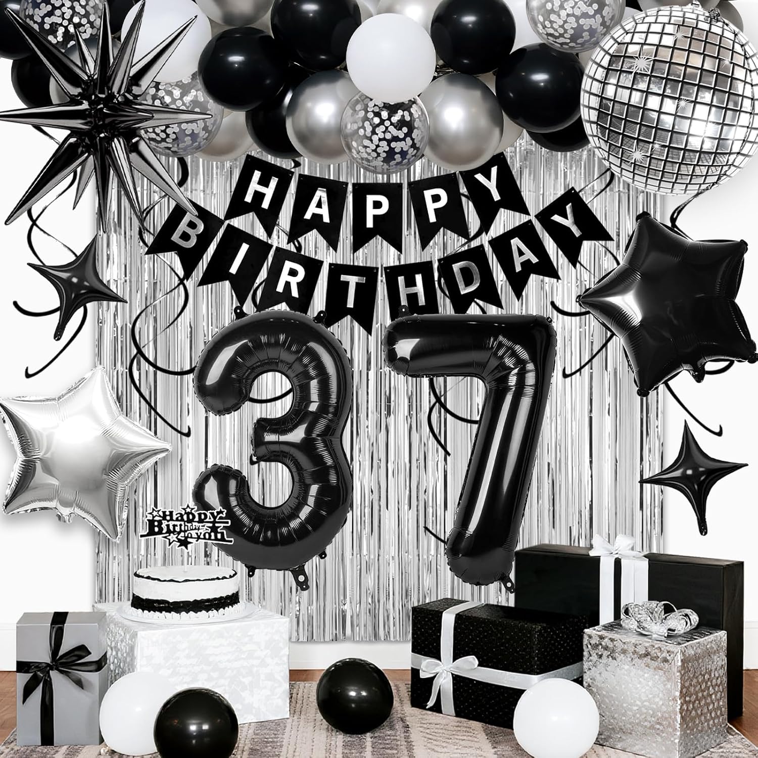 - ALL-IN-ONE 37th BIRTHDAY KIT: Your complete black and silver party set includes: 1x "HAPPY BIRTHDAY" Banner, 2x 32' Number Balloon, 1x22' Explosion Star Foil Balloons (Black), 2x18' Star Foil Balloons (Silver and Black), 1x28.9' Disco Foil Balloons (Silver), 6x Hanging Swirls, 2x Shiny Fringe Curtains (Silver), 1x Cake Topper, 2x10' Star Balloons, 6x 12" Silver Confetti Balloons, 8x 10" White Balloons, 8x 10" Black Balloons, 8x 10" Silver Balloons, 1x PLUS Balloon Chain, 1x Dot Stickers