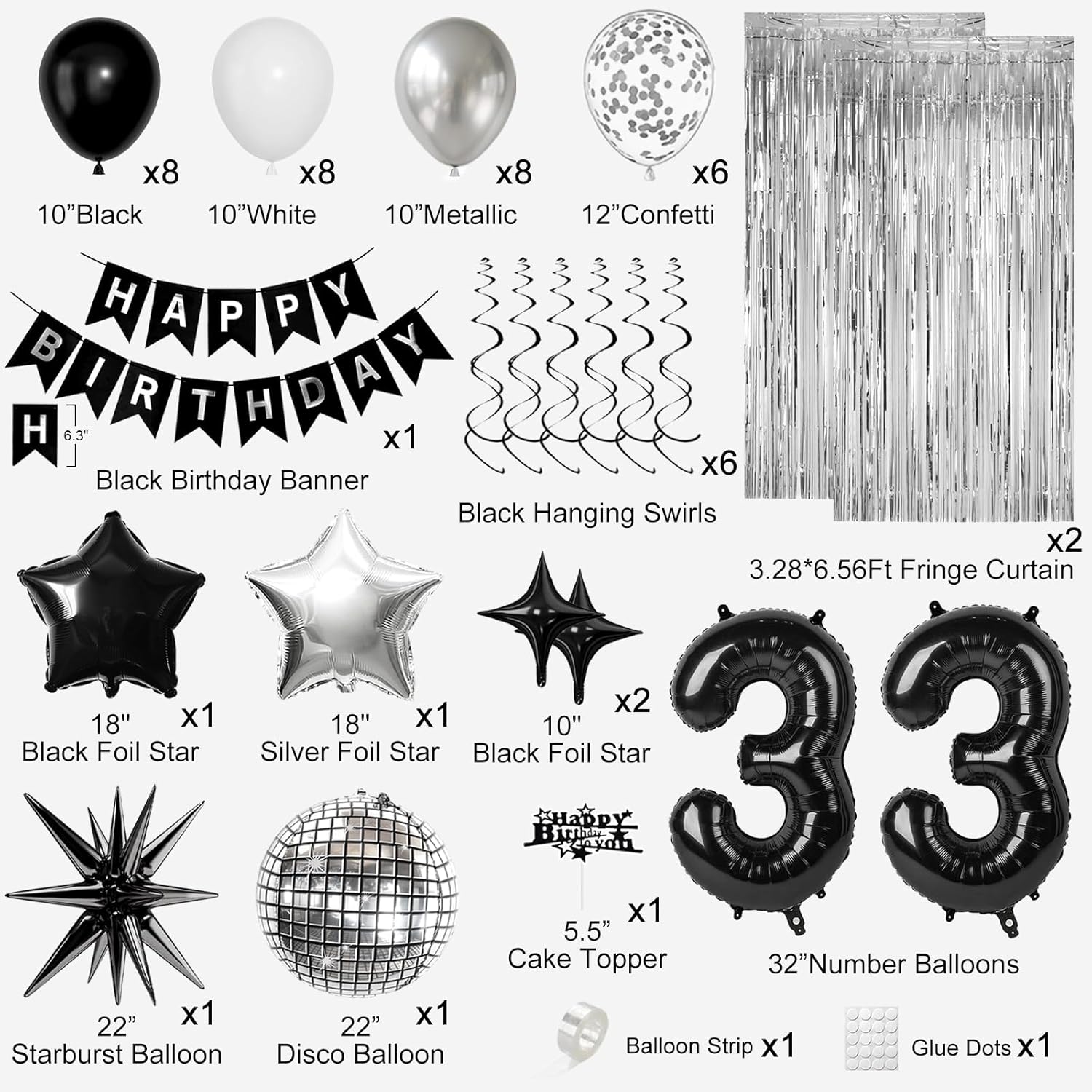 - ALL-IN-ONE 33rd BIRTHDAY KIT: Your complete black and silver party set includes: 1x "HAPPY BIRTHDAY" Banner, 2x 32' Number Balloon, 1x22' Explosion Star Foil Balloons (Black), 2x18' Star Foil Balloons (Silver and Black), 1x28.9' Disco Foil Balloons (Silver), 6x Hanging Swirls, 2x Shiny Fringe Curtains (Silver), 1x Cake Topper, 2x10' Star Balloons, 6x 12" Silver Confetti Balloons, 8x 10" White Balloons, 8x 10" Black Balloons, 8x 10" Silver Balloons, 1x PLUS Balloon Chain, 1x Dot Stickers
