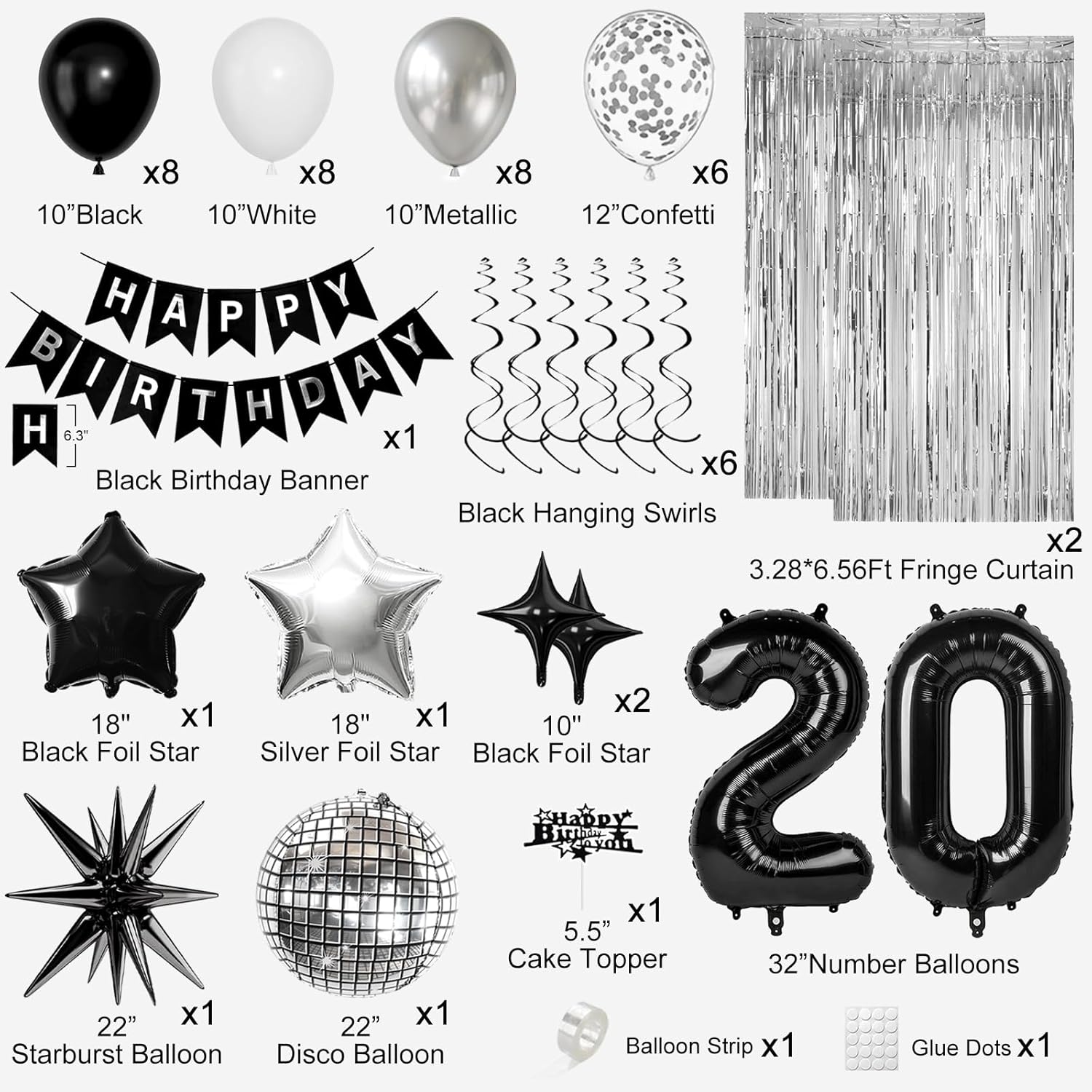- ALL-IN-ONE 20th BIRTHDAY KIT: Your complete black and silver party set includes: 1x "HAPPY BIRTHDAY" Banner, 2x 32' Number Balloon, 1x22' Explosion Star Foil Balloons (Black), 2x18' Star Foil Balloons (Silver and Black), 1x28.9' Disco Foil Balloons (Silver), 6x Hanging Swirls, 2x Shiny Fringe Curtains (Silver), 1x Cake Topper, 2x10' Star Balloons, 6x 12" Silver Confetti Balloons, 8x 10" White Balloons, 8x 10" Black Balloons, 8x 10" Silver Balloons, 1x PLUS Balloon Chain, 1x Dot Stickers