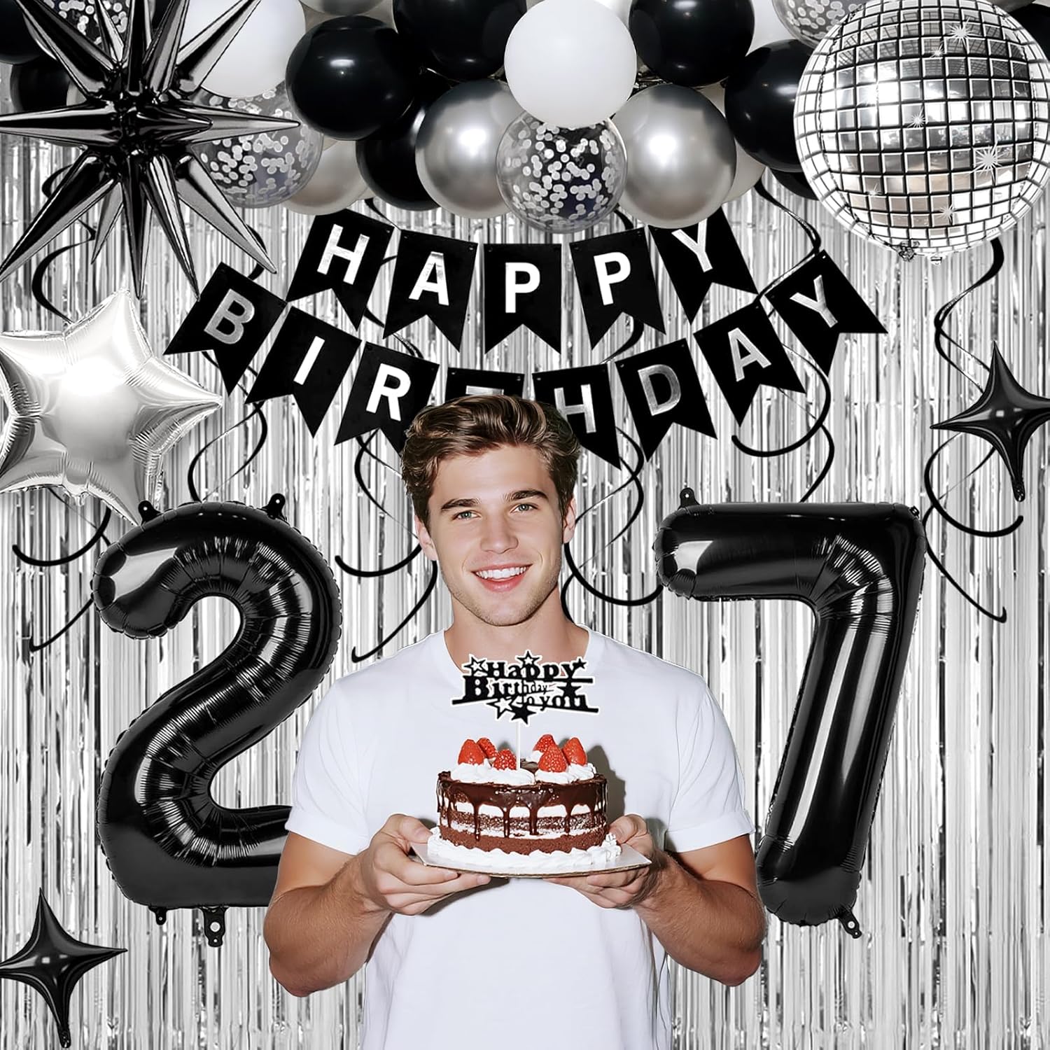 - ALL-IN-ONE 27th BIRTHDAY KIT: Your complete black and silver party set includes: 1x "HAPPY BIRTHDAY" Banner, 2x 32' Number Balloon, 1x22' Explosion Star Foil Balloons (Black), 2x18' Star Foil Balloons (Silver and Black), 1x28.9' Disco Foil Balloons (Silver), 6x Hanging Swirls, 2x Shiny Fringe Curtains (Silver), 1x Cake Topper, 2x10' Star Balloons, 6x 12" Silver Confetti Balloons, 8x 10" White Balloons, 8x 10" Black Balloons, 8x 10" Silver Balloons, 1x PLUS Balloon Chain, 1x Dot Stickers