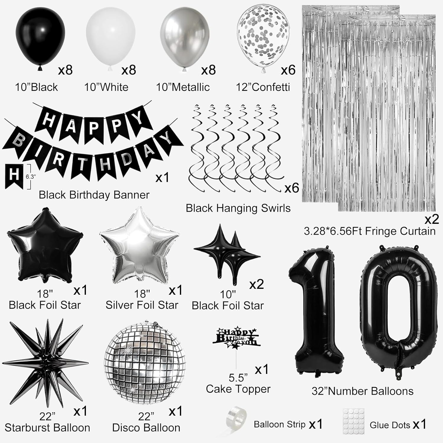 - ALL-IN-ONE 10th BIRTHDAY KIT: Your complete black and silver party set includes: 1x "HAPPY BIRTHDAY" Banner, 2x 32' Number Balloon, 1x22' Explosion Star Foil Balloons (Black), 2x18' Star Foil Balloons (Silver and Black), 1x28.9' Disco Foil Balloons (Silver), 6x Hanging Swirls, 2x Shiny Fringe Curtains (Silver), 1x Cake Topper, 2x10' Star Balloons, 6x 12" Silver Confetti Balloons, 8x 10" White Balloons, 8x 10" Black Balloons, 8x 10" Silver Balloons, 1x PLUS Balloon Chain, 1x Dot Stickers