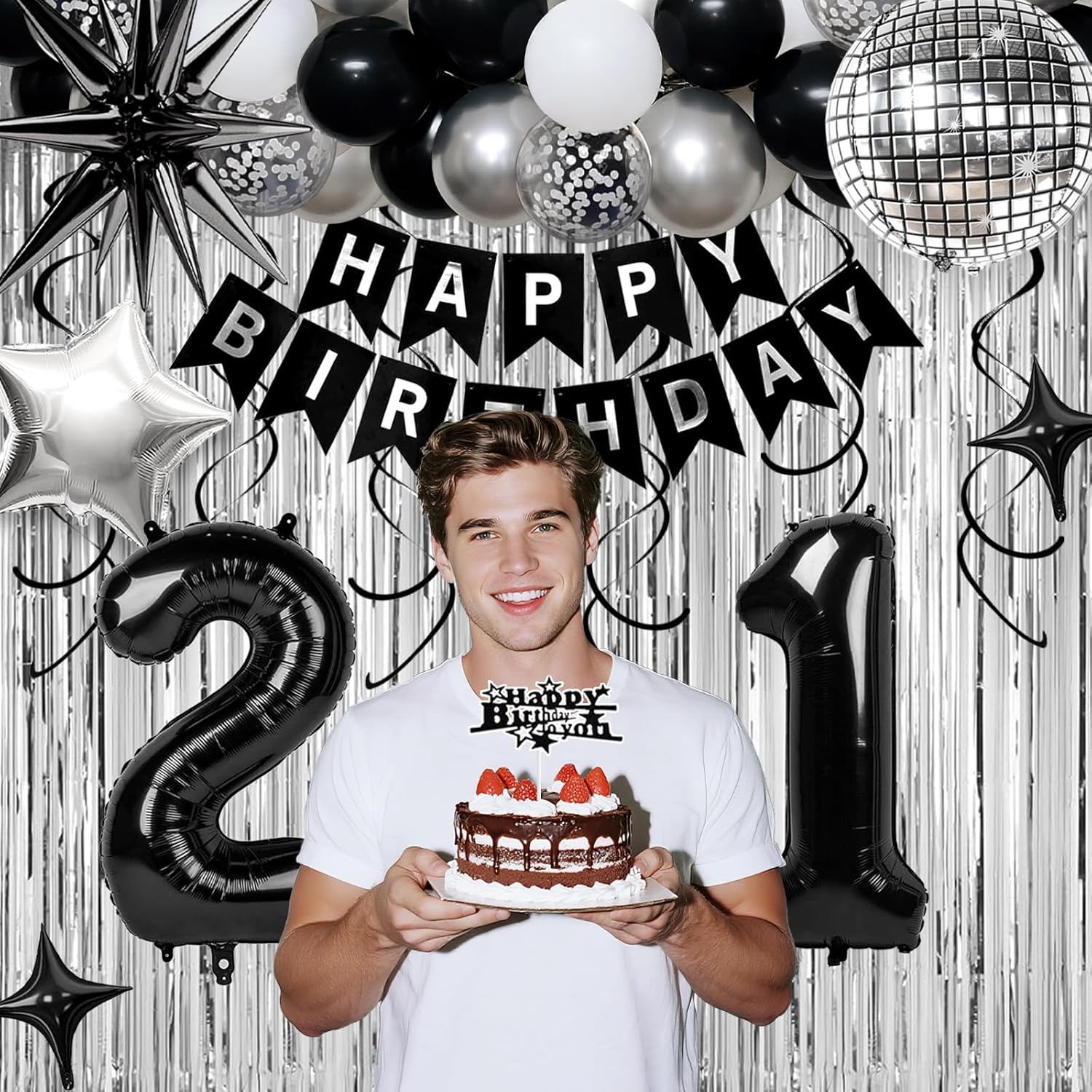 - ALL-IN-ONE 21st BIRTHDAY KIT: Your complete black and silver party set includes: 1x "HAPPY BIRTHDAY" Banner, 2x 32' Number Balloon, 1x22' Explosion Star Foil Balloons (Black), 2x18' Star Foil Balloons (Silver and Black), 1x28.9' Disco Foil Balloons (Silver), 6x Hanging Swirls, 2x Shiny Fringe Curtains (Silver), 1x Cake Topper, 2x10' Star Balloons, 6x 12" Silver Confetti Balloons, 8x 10" White Balloons, 8x 10" Black Balloons, 8x 10" Silver Balloons, 1x PLUS Balloon Chain, 1x Dot Stickers