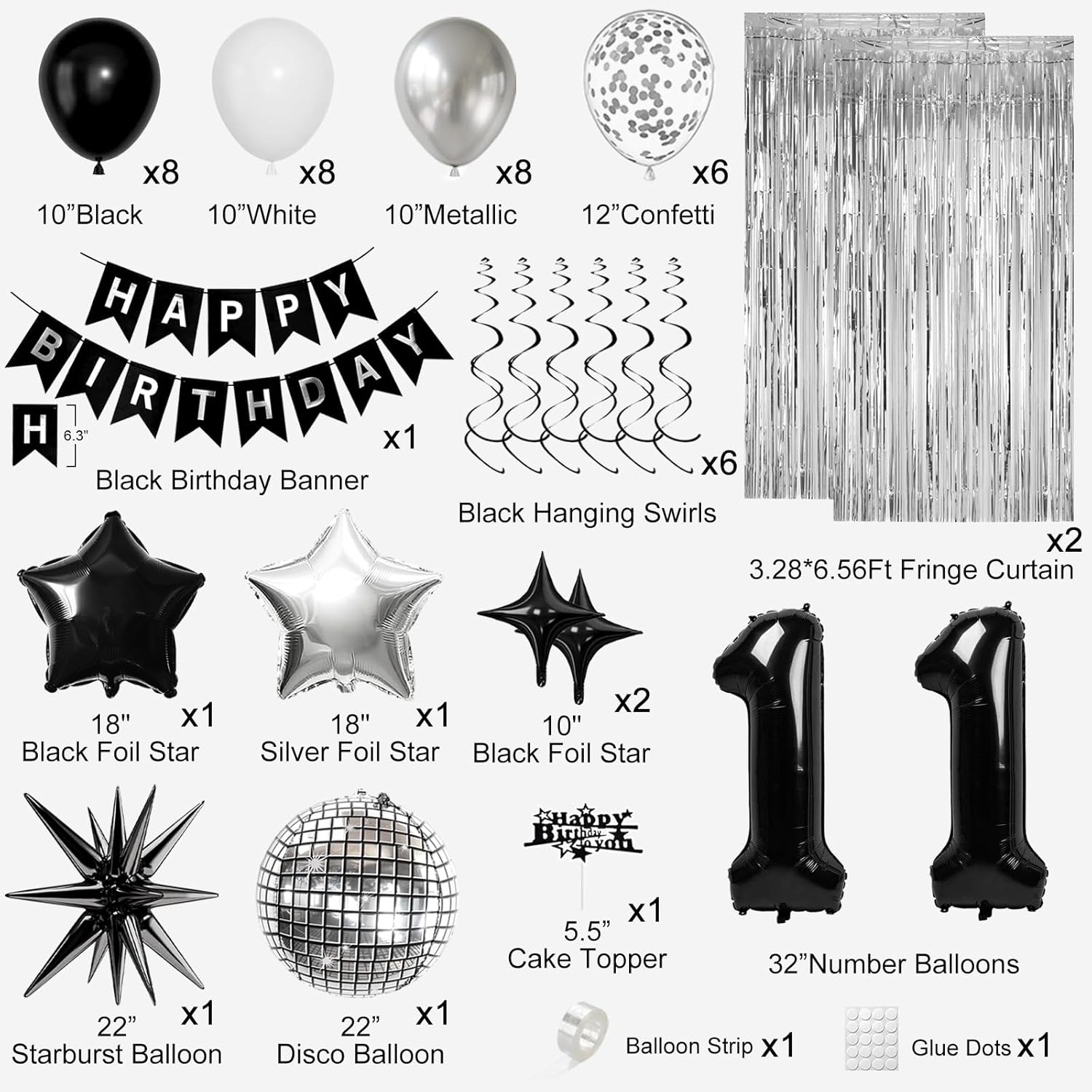 - ALL-IN-ONE 11th BIRTHDAY KIT: Your complete black and silver party set includes: 1x "HAPPY BIRTHDAY" Banner, 2x 32' Number Balloon, 1x22' Explosion Star Foil Balloons (Black), 2x18' Star Foil Balloons (Silver and Black), 1x28.9' Disco Foil Balloons (Silver), 6x Hanging Swirls, 2x Shiny Fringe Curtains (Silver), 1x Cake Topper, 2x10' Star Balloons, 6x 12" Silver Confetti Balloons, 8x 10" White Balloons, 8x 10" Black Balloons, 8x 10" Silver Balloons, 1x PLUS Balloon Chain, 1x Dot Stickers