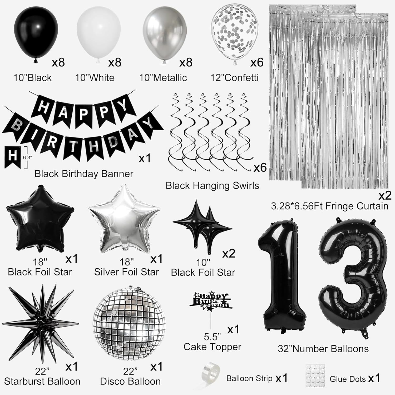 - ALL-IN-ONE 13th BIRTHDAY KIT: Your complete black and silver party set includes: 1x "HAPPY BIRTHDAY" Banner, 2x 32' Number Balloon, 1x22' Explosion Star Foil Balloons (Black), 2x18' Star Foil Balloons (Silver and Black), 1x28.9' Disco Foil Balloons (Silver), 6x Hanging Swirls, 2x Shiny Fringe Curtains (Silver), 1x Cake Topper, 2x10' Star Balloons, 6x 12" Silver Confetti Balloons, 8x 10" White Balloons, 8x 10" Black Balloons, 8x 10" Silver Balloons, 1x PLUS Balloon Chain, 1x Dot Stickers