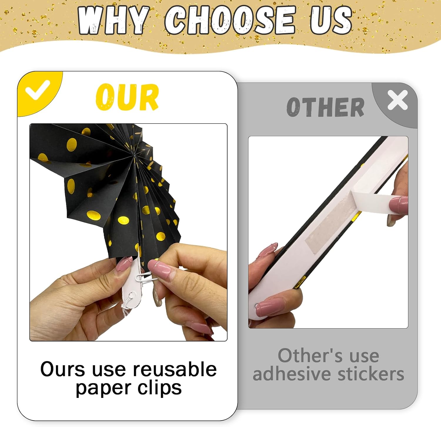 - 【Material】: Our black and gold paper lanterns are made of quality thin paper and wire bracket. They are lightweight and biodegradable, and effortless to hang and store. More environmentally friendly than traditional balloon decorations. Meanwhile, compared to other paper fans party decorations that use adhesive stickers, our hanging paper fans all use reusable paper clips.