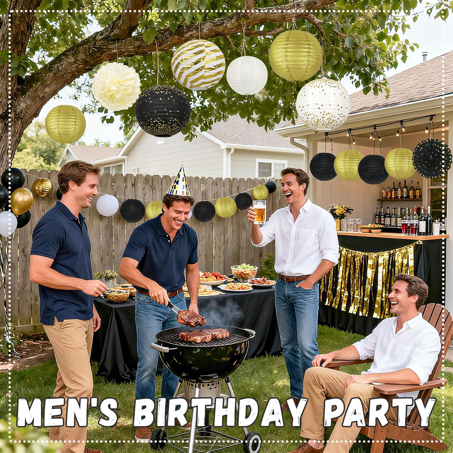 14Pcs Black and Gold Party Decorations, Hanging Paper Lanterns Fans Tissue Flower Pom Poms for Men Birthday Graduation Retirement New Years Decorations New Years Eve Party Supplies 2026