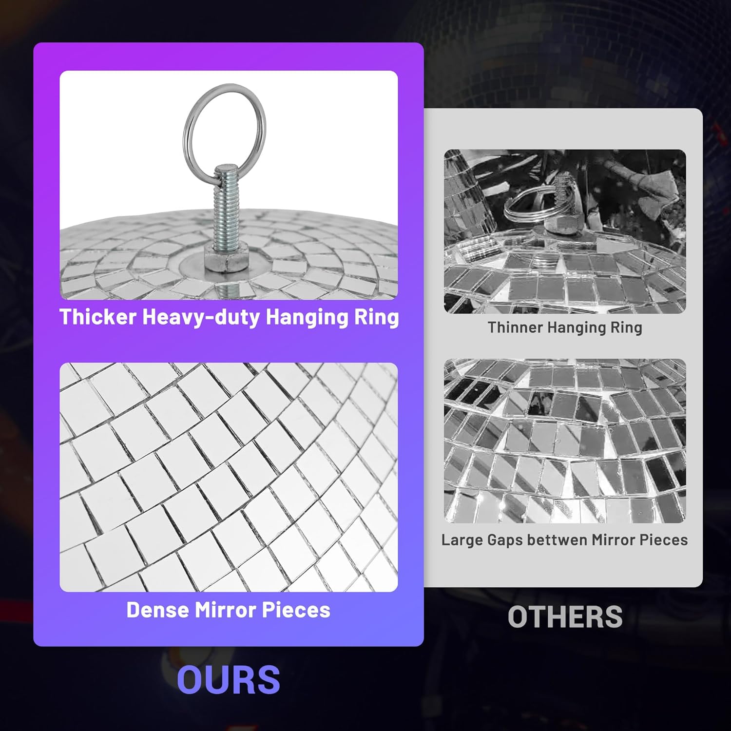 - Easy Installation - No assembly required, with a built-in hanging ring that easily attaches to a rotating motor, or place the mirror ball on the floor or anywhere you like for decoration