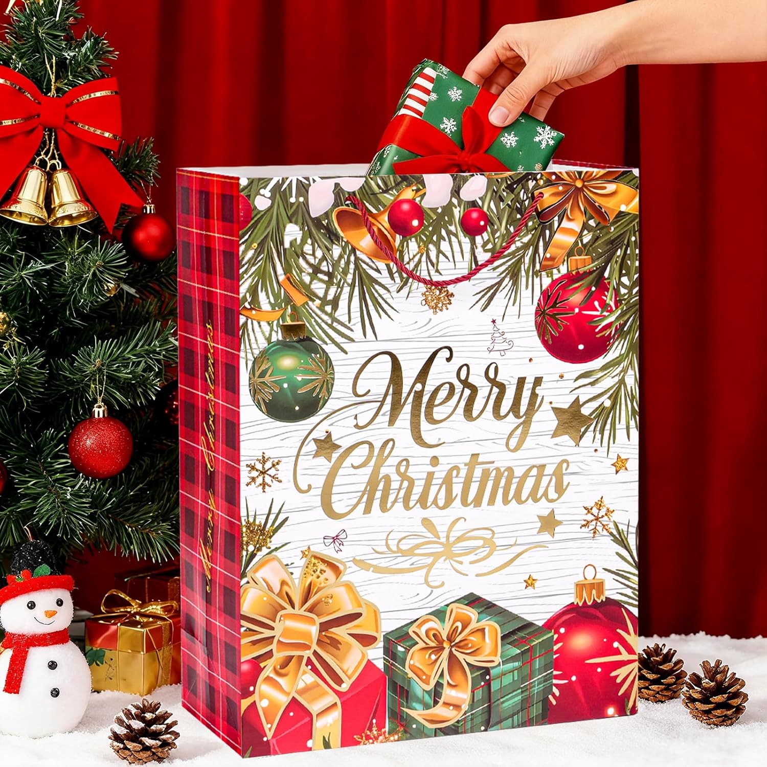 - 【Large Christmas Gift Bags】Our large gift bags are designed for the holiday season. Each gift bag measures 12.2" (L) x 4.7" (W) x 15.7" (H) when unfolded, offering ample interior space for wrapping gifts of all shapes. Eight sheets of festive tissue paper are included to enhance the visual appeal of your gifts. Not only are they perfect for Christmas gift giving, their versatility and large capacity also make them suitable for other everyday uses and special occasions.