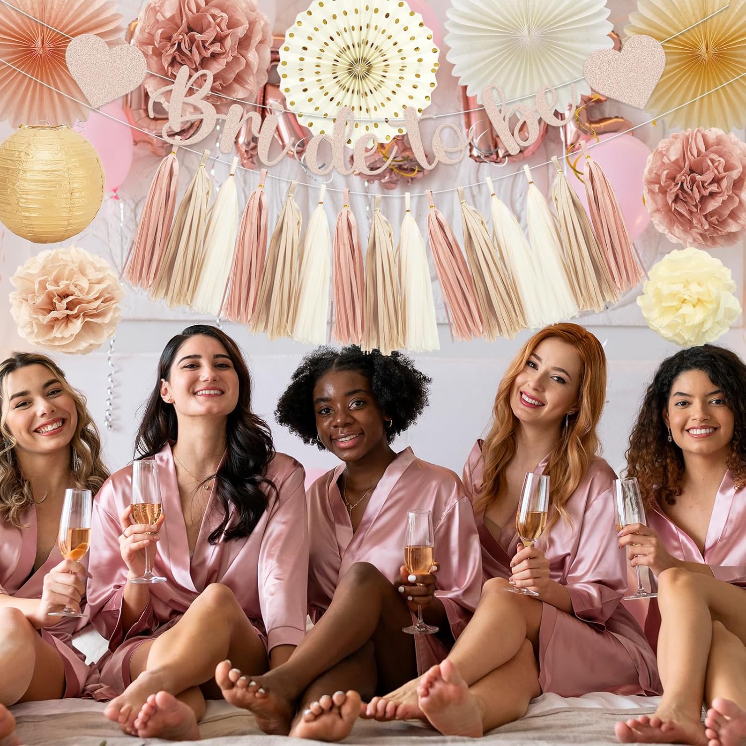 Whaline 22Pcs Boho Champagne Gold Pink Bachelorette Party Decoration Bride to Be Banner Hanging Lanterns Paper Fans Pom Poms Tassel Garlands for Wedding Bridal Shower Backdrop