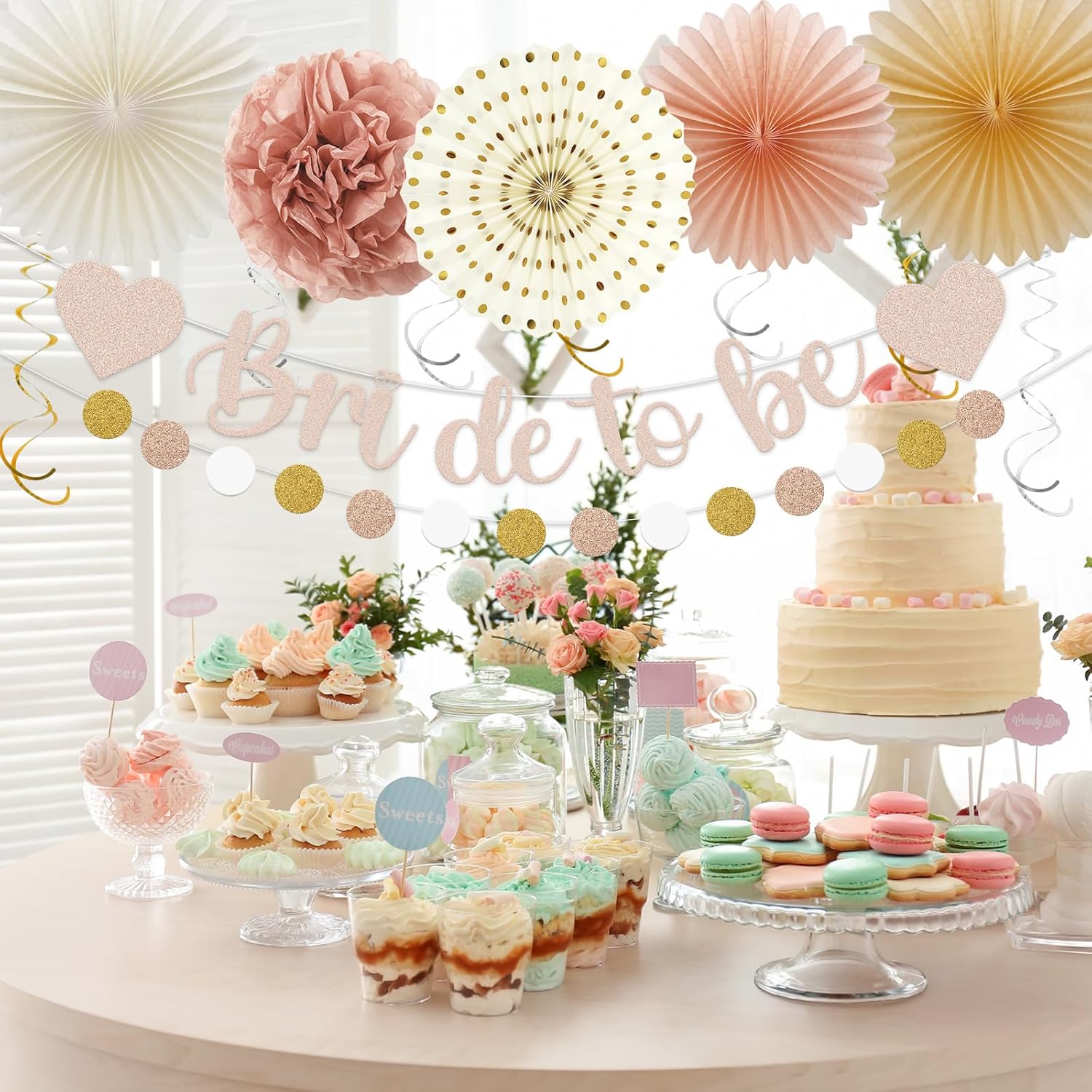 - Package Includes: 4 pcs paper fans, 6 pcs hanging swirls, 1 pc bride to be letter banner, 1 pc fringe tassel garland, 1 pc round dot garland, 3 pcs round lanterns, 4 pcs tissue pom poms and 2 pcs honeycomb balls, a total of 22 pcs. Complete accessories perfect for your home and party decoration