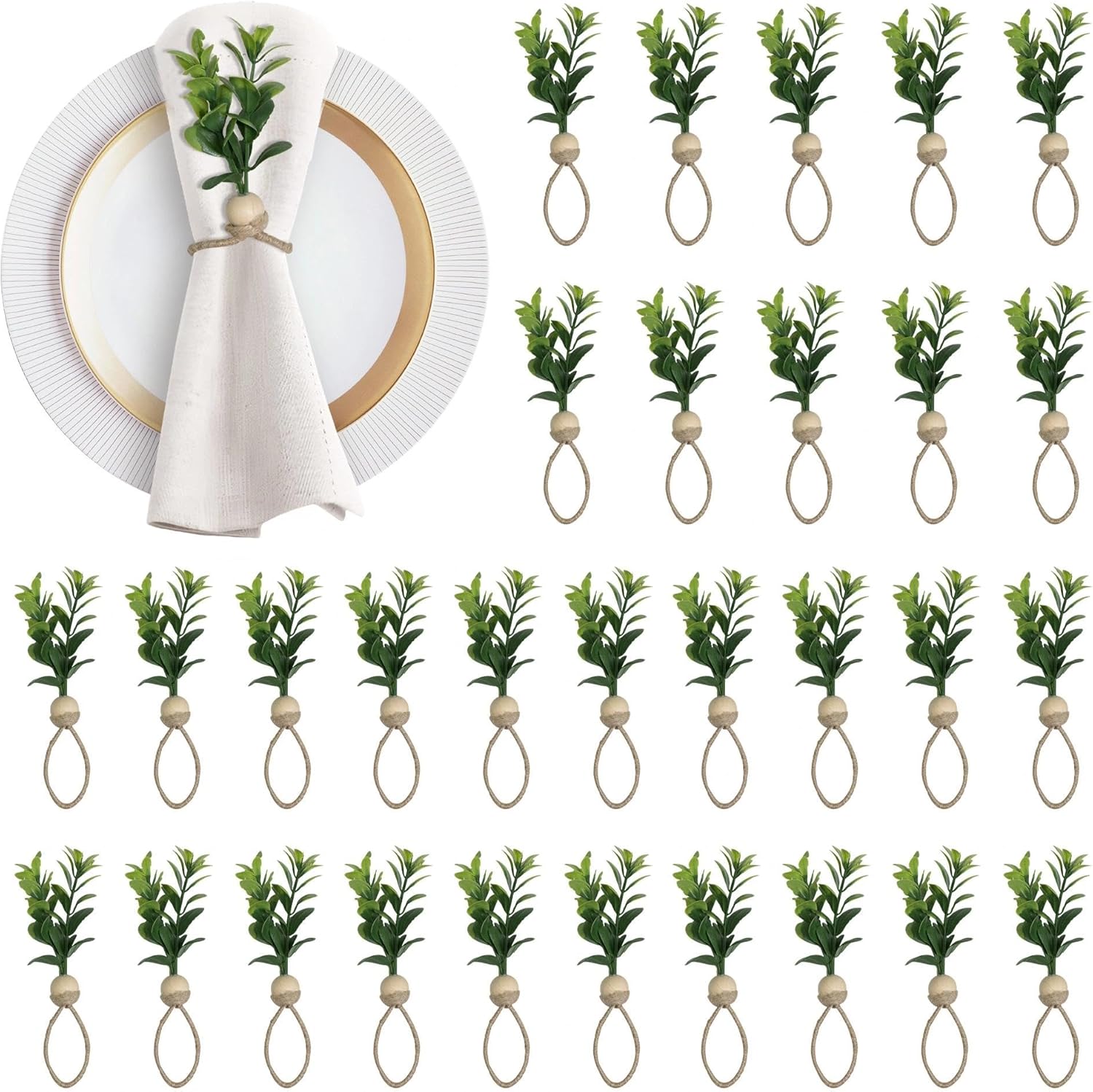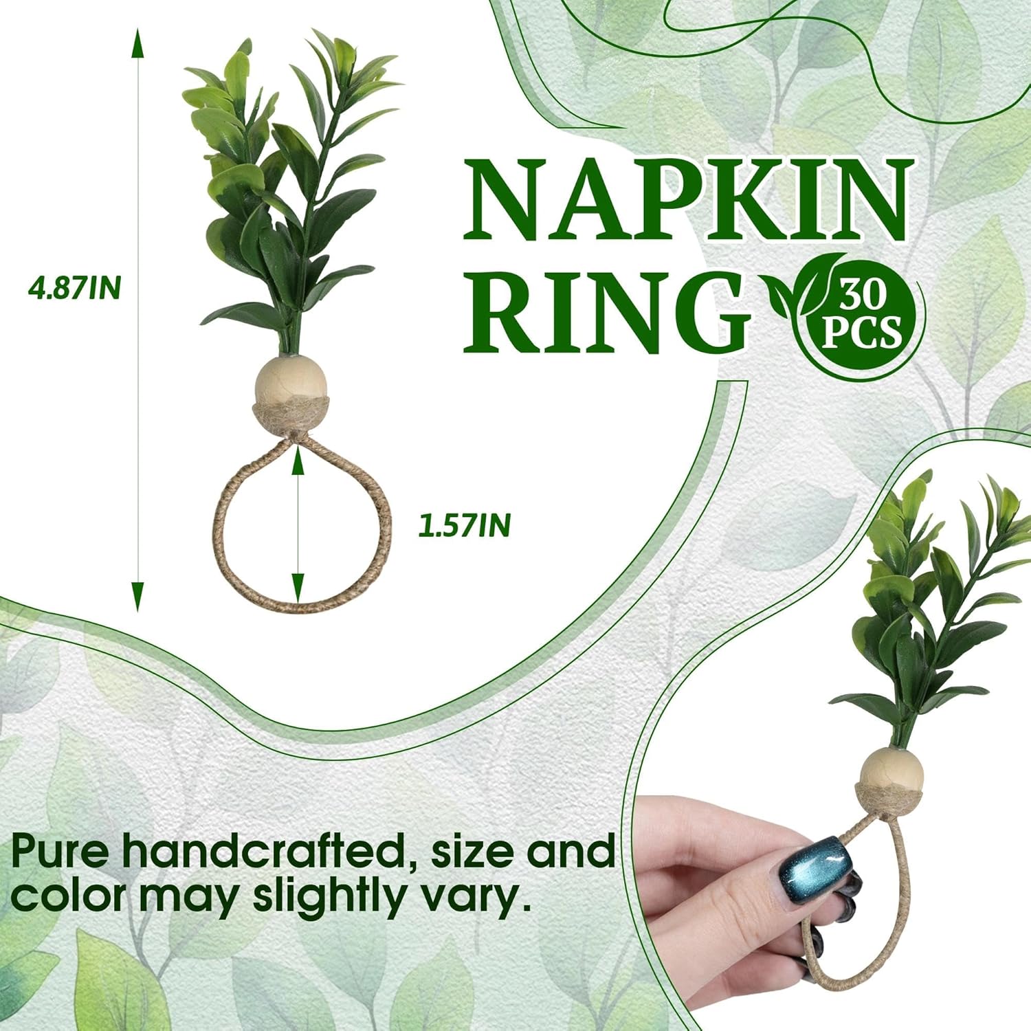 - BOHEMIAN ART DESIGN: The 4.87 Γ 1.57 inch standard size green leaf napkin ring holder features a three-layer exquisite design, with a natural linen woven ring at the bottom, solid wood beads as the connecting core in the middle, and artificial green plant branches at the top, presenting a fresh and natural forest beauty. The exquisite eucalyptus rings napkin perfectly complements various festive atmospheres and adds a unique atmosphere to gatherings.
