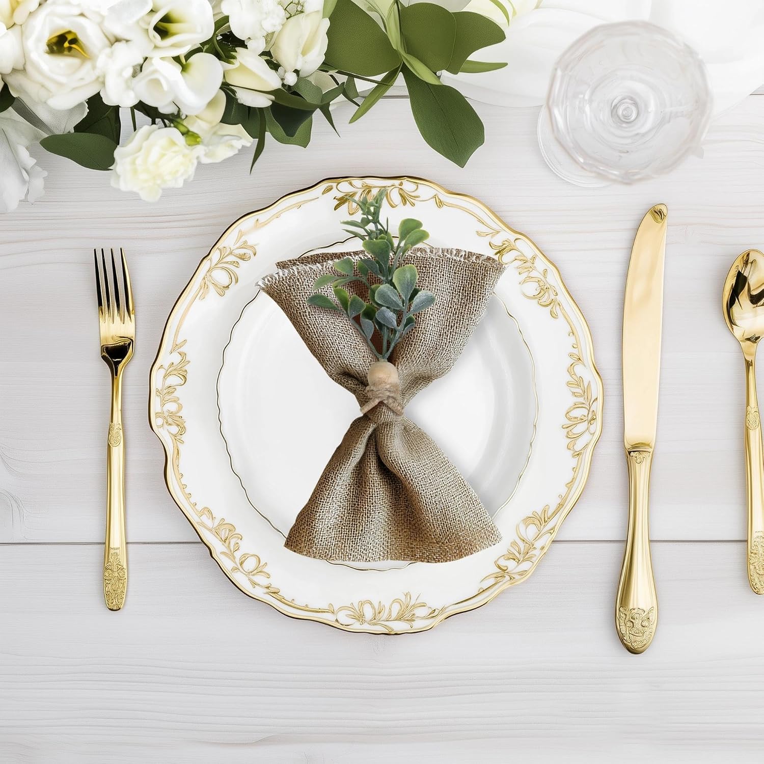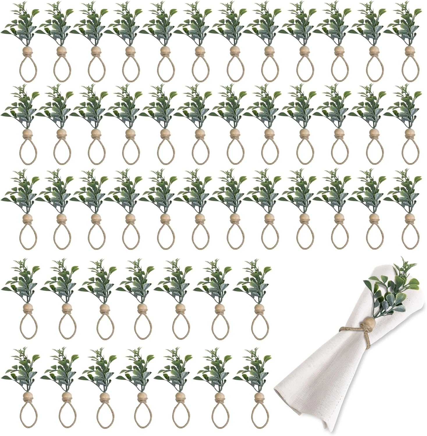 - NAPKIN RINGS SET OF 50: Each green napkin rings handmade fora artificial flowers, wooden beads, and linen fabric, which is both sturdy, durable, lightweight, and natural. Eucalyptus napkin holder the multifunctional design can perfectly adapt to various styles of napkins, whether it is for daily family dining or formal banquet occasions, it will definitely add unique charm to your dining table.