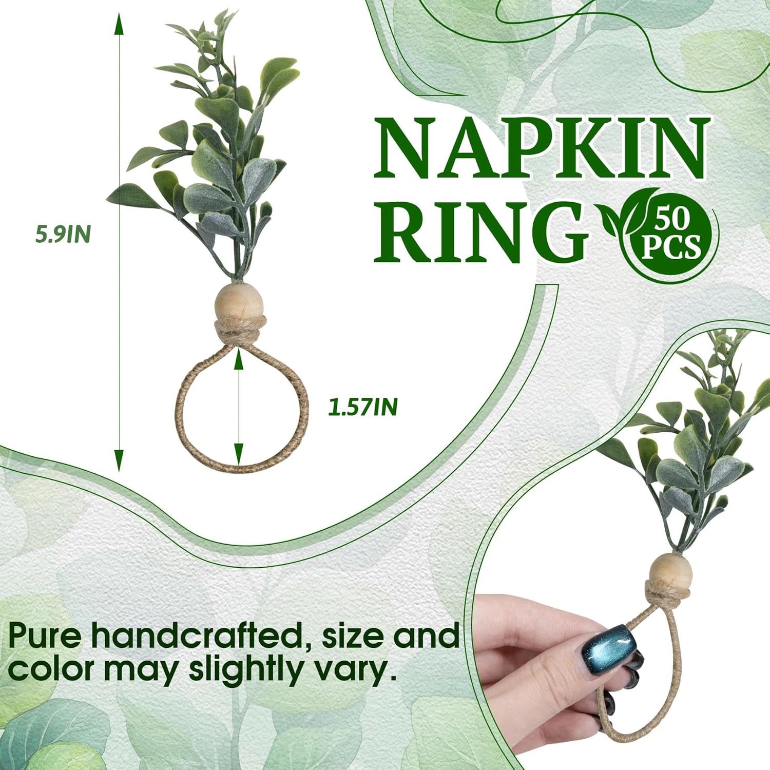 - BOHEMIAN ART DESIGN: The 5.9 Γ 1.57 inch standard size size green leaf napkin ring holder features a three-layer exquisite design, with a natural linen woven ring at the bottom, solid wood beads as the connecting core in the middle, and artificial green plant branches at the top, presenting a fresh and natural forest beauty. The exquisite eucalyptus rings napkin perfectly complements various festive atmospheres and adds a unique atmosphere to gatherings.