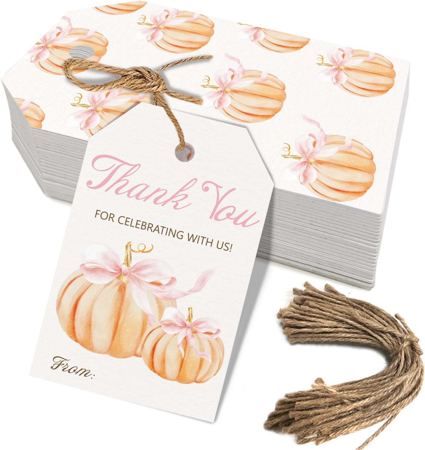 - Package Includes: You will receive 50 pcs pumpkin gift tags and 50 roots hemp rope, each says " Thank You for CELEBRATING WITH US " These pumpkin tags decorations will definitely make your birthday or baby shower party fabulously attractive.