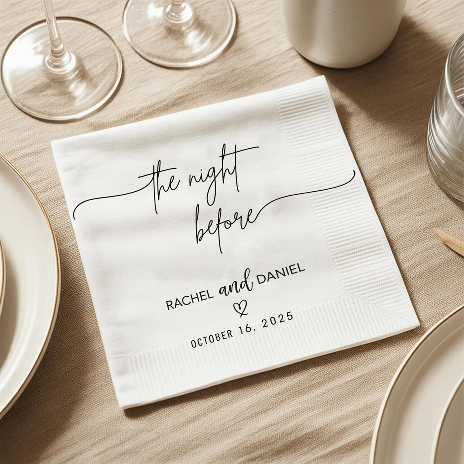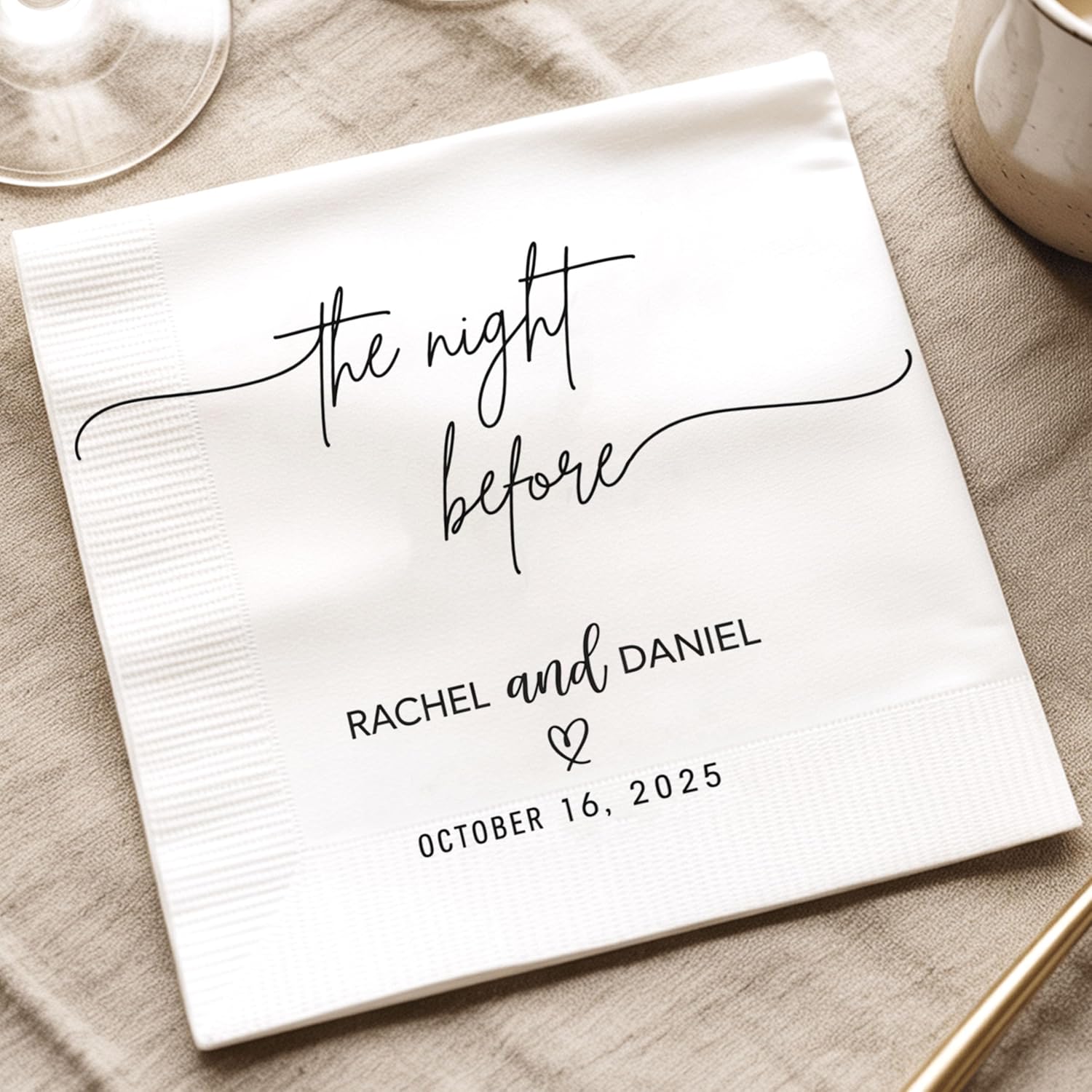 - Personalized Wedding Napkin with Custom Names and Date: Add a meaningful touch to your special day with custom wedding napkins featuring your names and wedding date. These personalized napkins are perfect for receptions, cocktail hours, and rehearsal dinners. A timeless detail that helps capture your story in every place setting.