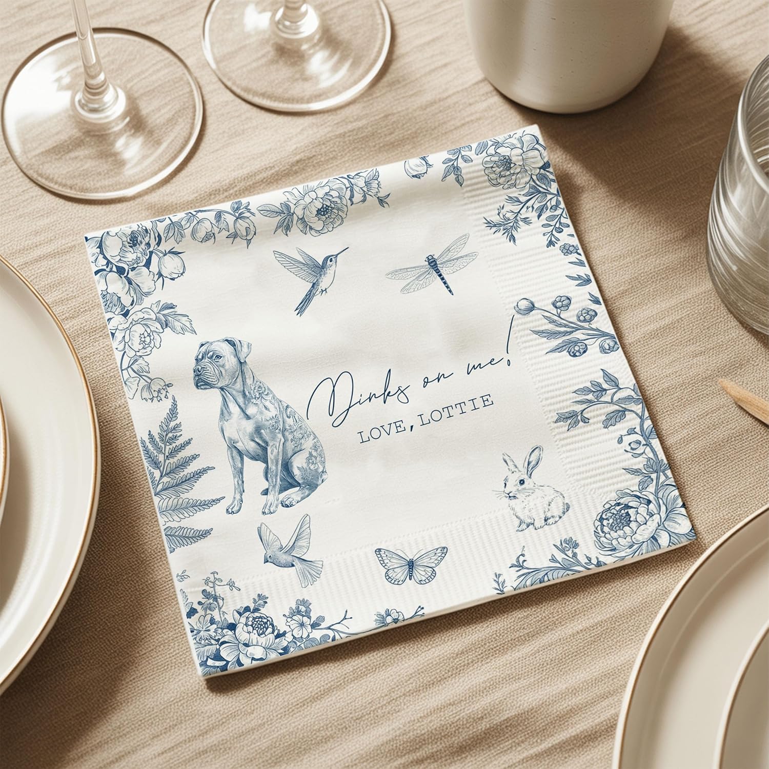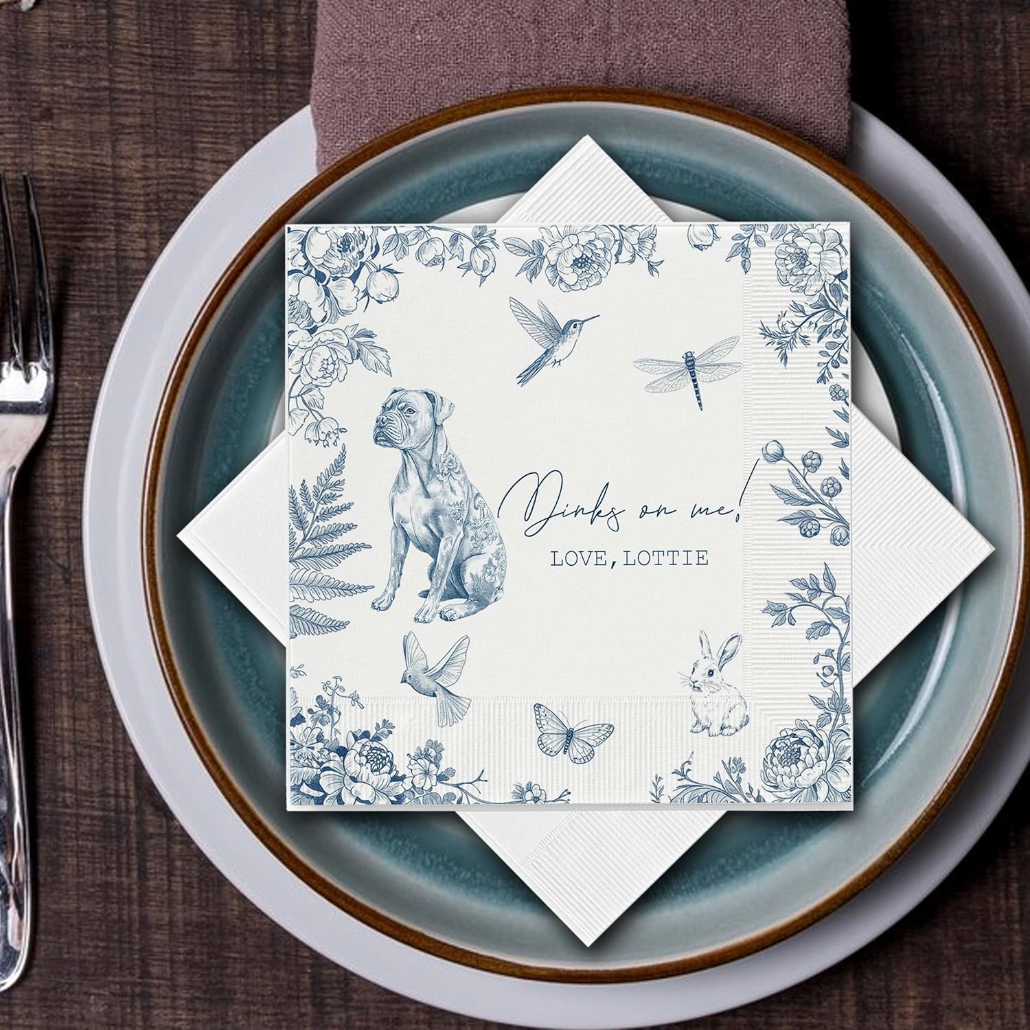 Luxury Personalized Dog Wedding Napkins, Custom Wedding Cocktail Napkins, Blue Floral Cocktail Napkin, Napkin for Pet Lovers, Anniversary, Bridal, Engagement Party, Bridal Shower