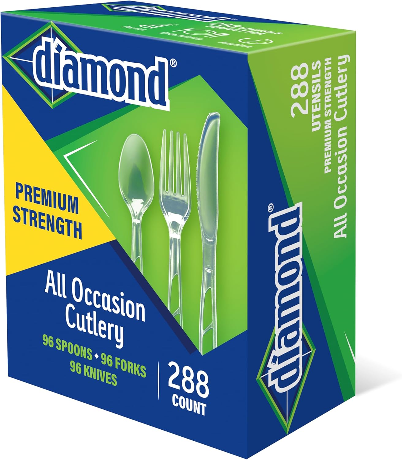 Diamond® All Occasion Clear Disposable Cutlery Set 288 Count – 96 Forks, 96 Spoons, 96 Knives, Premium Polystyrene, Crystal Clear, Party & Everyday Use