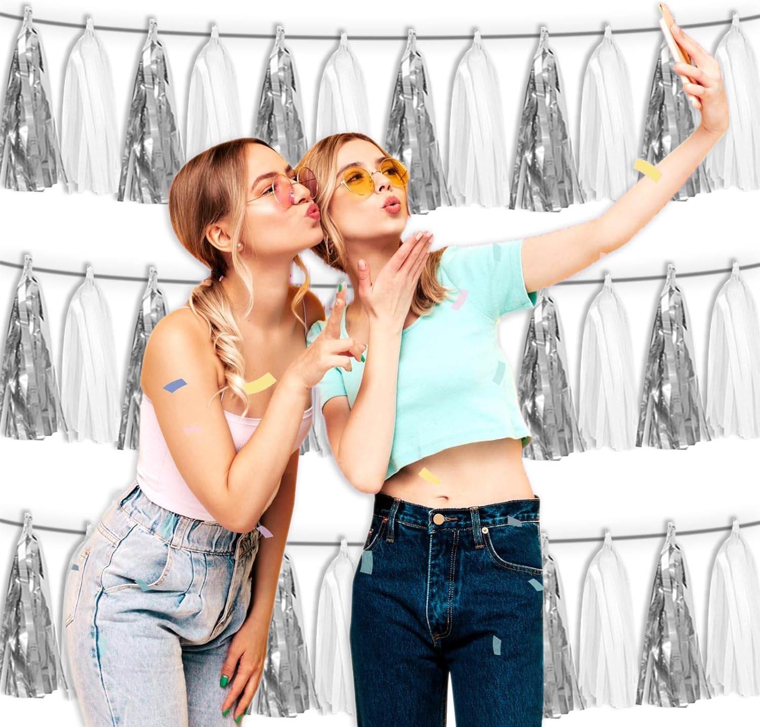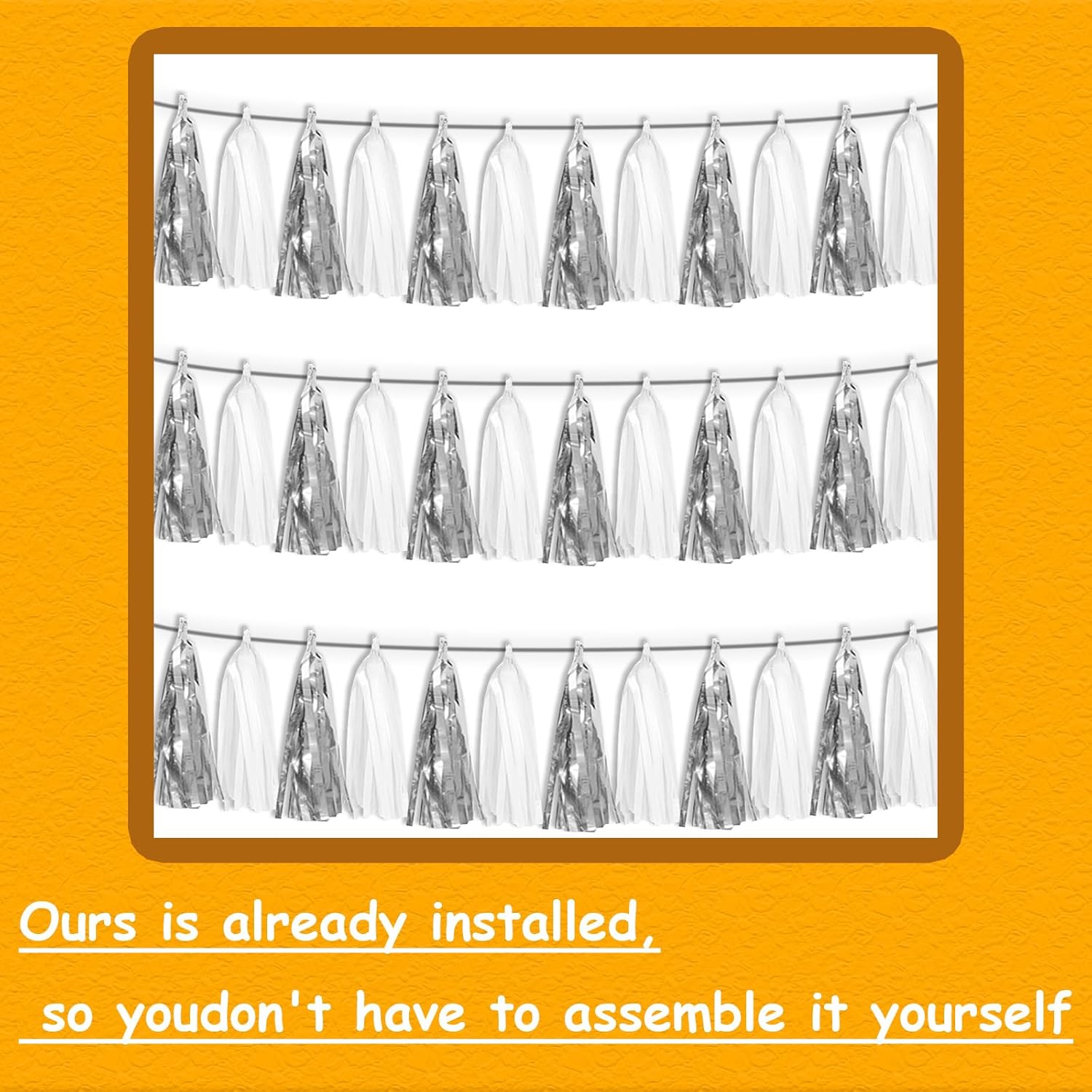 - 【Package Includes】The total length of the silver white birthday tassels banner is 30 feet, divided into 3 strips, each 10 feet long. Each banner contains 15 tassels, and each tassel measures 14 inches, for birthday decorations many occasions uitable for Patriotic display, Homecoming Float, Christmas Float, ecorative metal trailers, graduation floats etc