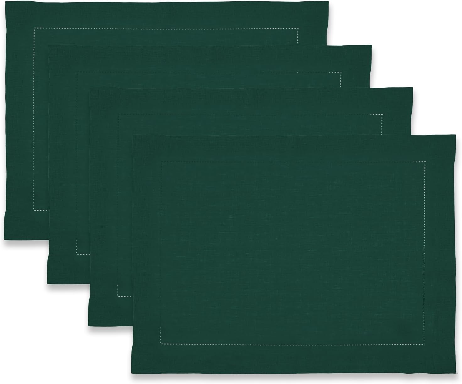 100% Pure Linen Green Placemats 14 x 19 Inch - Hemstitch Christmas Placemats Set of 4 – Elegant Cloth Fabric Table Mats for Winter, Thanksgiving & New Year Décor – Elara Collection