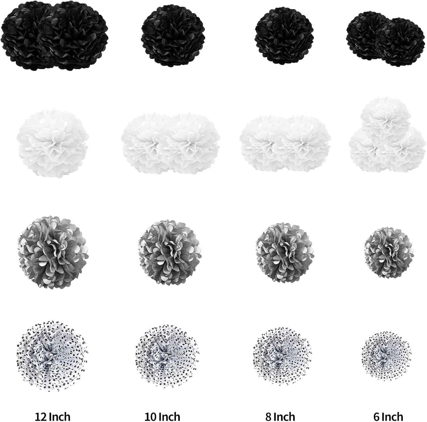 Tissue Paper Pompoms Paper Flower 22 Pcs Black,Silver, Polka Dot, White Paper Flower Ball for Birthday Bachelorette Wedding Baby Shower Bridal Shower Party Decoration (Pack of 2)