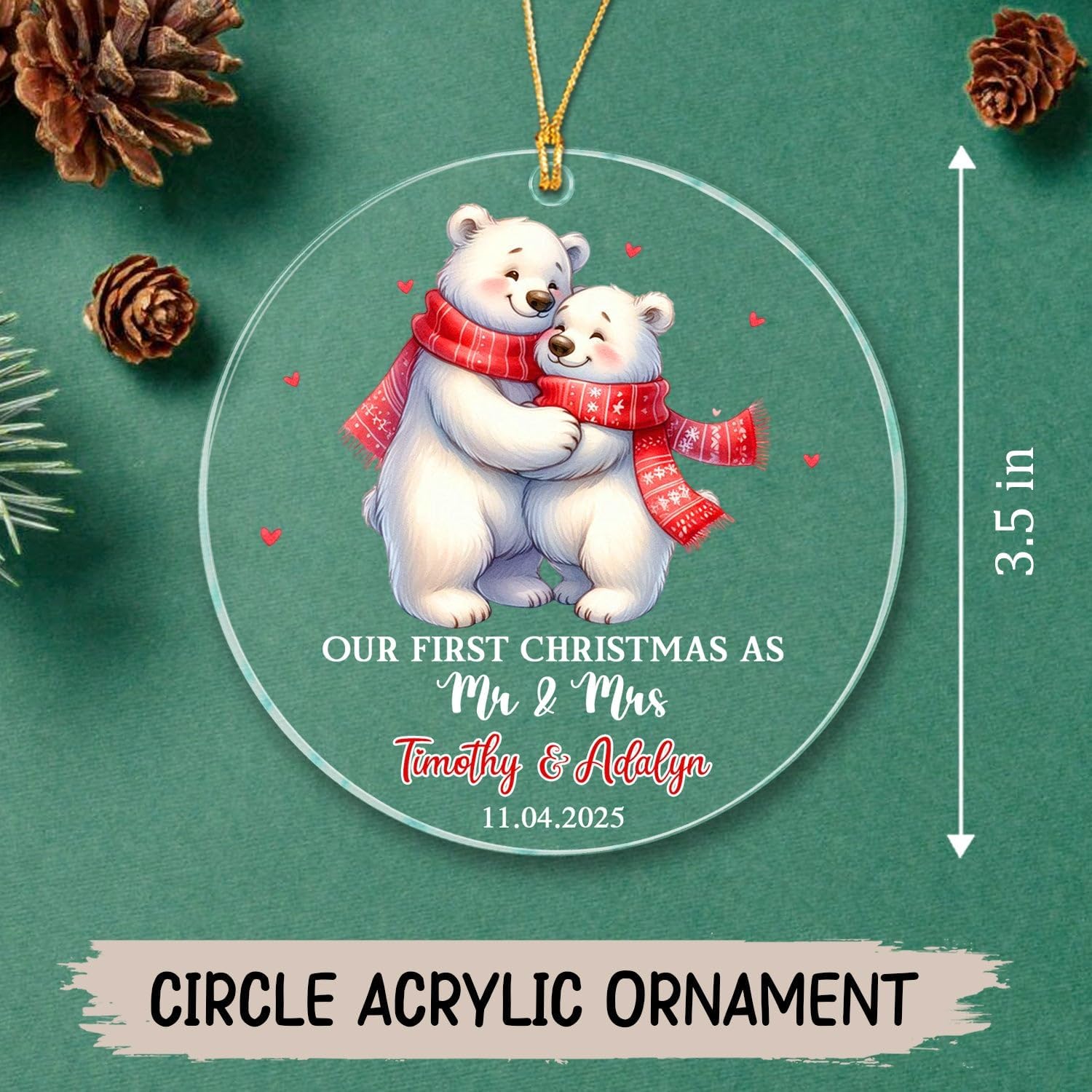 - PERSONALIZED CHRISTMAS ORNAMENTS: Add festive charm to your holiday décor with this round acrylic ornament, polished with smooth edges and crafted for lasting beauty. A thoughtful keepsake for Mr & Mrs, Husband & Wife, Dad, Mom, Grandparents, Married Couple, Newlyweds, Newly Engaged, Bride & Groom To Be, Friends, Coworker, Besties, it makes every holiday more memorable. Click “Customize Now” to personalize your ornament and create a decoration that will be enjoyed for years to come.