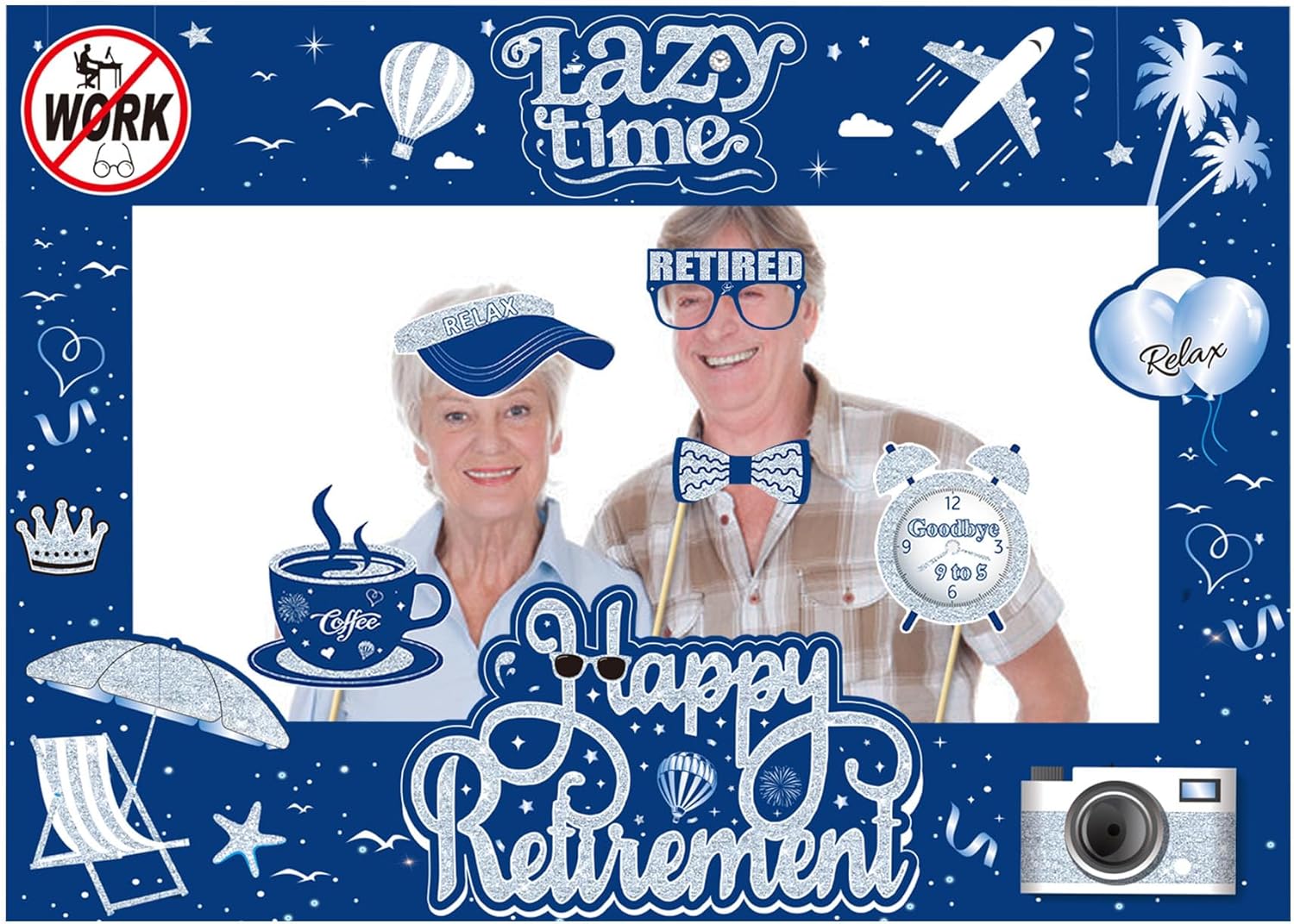 - Complete Retirement Photo Booth Set: Includes 27 unique paper photo props (like "Happy Retirement", "No Work Zone", "Enjoy the Next Chapter" signs, fun hats, glasses, and more) plus 1 large photo frame with "Lazy Time" and "Happy Retirement" designs. Everything you need to create hilarious, memorable photos at retirement parties, farewell gatherings, or office celebrations.